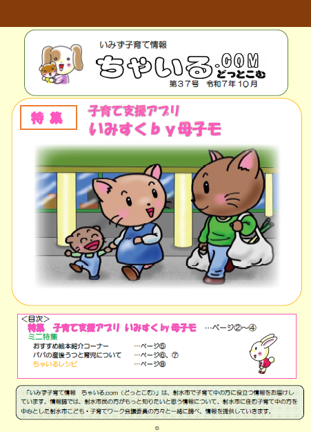 第37号(令和7年10月発行)特集:「子育て支援アプリ いみすくby母子モ」いみすくby母子モの登録方法や機能、パパの産後うつと育児、おすすめ絵本について紹介しています。
