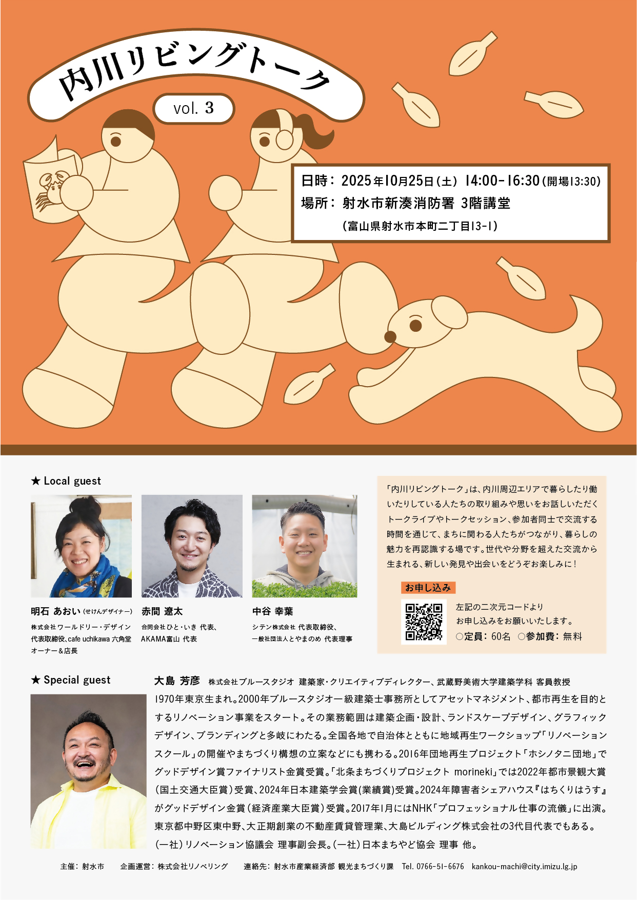 内川リビングトーク vol.3 を開催します! 2025年10月3日更新 シェア ポスト 開催期間:2025年10月25日 開催時間:14:00-16:30(開場13:30)開催場所:射水市新湊消防署 3階講堂(射水市本町二丁目13-1)費用:無料 内川リビングトークとは? 観光まちづくり課では、空き家の利活用に取り組む中で、「暮らし」の目線でまちの将来を考えていくため、今回のトークイベントを企画しました。 当日は、内川周辺エリアで暮らしたり働いたりしている人たちの取り組みや思いをお話しいたただくトークライブやトークセッション、参加者同士で交流する時間を通じて、まちに関わる人たちがつながり、暮らしの魅力を再認識できる機会です。 イベントを通じてお互いに内川の魅力を深め合い、刺激し合い 、これからの内川での暮らしがますます魅力的になっていく時間をお過ごしください。 特に、内川周辺エリアでチャレンジしたいと考えていらっしゃる方や、空き家の利活用に興味・関心がある方は、ぜひご参加ください! 概要 日時:2025年10月25日(土)14:00-16:30(開場13:30) 場所:射水市新湊消防署 3階講堂(射水市本町二丁目13-1) 参加費:無料 定員:60名(事前申込制) 申込:専用フォームは こちら ローカルゲスト 明石 あおい さん (せけんデザイナー) 株式会社 ワールドリー・デザイン 代表取締役カフェuchikawa六角堂 オーナー&店長 【プロフィール】京都府生まれ。5~18歳まで富山で育つ。大学進学で上京し卒業後はまちづくりシンクタンクに就職。全国各地で地域活性化のための拠点整備や公民協働のまちづくりに携わる。 2010年富山にUターンし県定住コンシェルジュとして活動後、まちづくりとデザインの会社「ワールドリー・デザイン」を設立。2016年、射水市内川に事務所を移転し、2021年からは路地で極短営業の紙モノショップやリソグラフ印刷工房をスタート。2024年4月、夫からカフェを事業承継しオーナー兼店長に。三度の飯より紙工作が好き。 赤間 遼太 さん 合同会社ひと・いき 代表 AKAMA富山 代表 【プロフィール】横浜国立大学工学部建設学科にてインフラや地域防災について学ぶ。卒業後、大手不動産会社で不動産仲介に携わり、2020年に独立し、「地域×不動産×金融」をテーマに、空き家再生や事業用不動産の利活用を手がける。 2024年には、鎌倉長谷にて飲食・宿泊・サウナを複合した拠点「AKAMA鎌倉」を開業。 2025年からは富山・新湊の漁師町で、廃屋となっていた番屋を再生し、漁師町ならではの体験型宿泊施設「AKAMA富山」を推進中。地元金融機関とクラウドファンディングを組み合わせた協調融資により、新しい資金調達モデルも実現。 「不動産をまちに開き、人と地域をつなげる場をつくる」ことをライフワークとし、鎌倉・富山の双方で持続可能なまちづくりに取り組んでいる。 中谷 幸葉 さん シテン株式会社 代表取締役 一般社団法人とやまのめ 代表理事 【プロフィール】1992年茨城県生まれ。早稲田大学スポーツ科学部卒業後、三菱東京UFJ銀行に就職。 法人営業を経て、M&Aのアドバイザリー業務に従事。その後富山県へIターン。街づくり会社TOYAMATOの設立及び取締役に就任。2023年に射水市にある築100年の古民家に移住し、一般社団法人とやまのめを設立。 現在は約60名の仲間と共に、地域や社会課題の解決に挑戦する。アグリスポーツやウニとやさいクルプロジェクト等が進行中。その後、2024年4月に一次産業をアップデートすることを目的にシテン㈱を設立し、富山で唯一のスプラウト農家を事業承継。第二弾として、鮎料理屋さんを承継し、今後も地域資産を新しい視点で未来へつないでいく。 スペシャルゲスト 大島 芳彦 さん 株式会社ブルースタジオ 建築家・クリエイティブディレクター、武蔵野美術大学建築学科 客員教授 【プロフィール】 1970年東京生まれ。2000年ブルースタジオ一級建築士事務所としてアセットマネジメント、都市再生を目的とするリノベーション事業をスタート。その業務範囲は建築企画・設計、ランドスケープデザイン、グラフィックデザイン、ブランディングと多岐にわたる。全国各地で自治体とともに地域再生ワークショップ「リノベーションスクール」の開催やまちづくり構想の立案などにも携わる。2016年団地再生プロジェクト「ホシノタニ団地」でグッドデザイン賞ファイナリスト金賞受賞。「北条まちづくりプロジェクト morineki」では2022年都市景観大賞(国土交通大臣賞)受賞、2024年日本建築学会賞(業績賞)受賞。2024年障害者シェアハウス『はちくりはうす』がグッドデザイン金賞(経済産業大臣賞)受賞。2017年1月にはNHK「プロフェッショナル仕事の流儀」に出演。東京都中野区東中野、大正期創業の不動産賃貸管理業、大島ビルディング株式会社の3代目代表でもある。(一社)リノベーション協議会 理事副会長。(一社)日本まちやど協会 理事 他。 お問い合わせ 産業経済部 観光まちづくり課 所在地:〒934-0011 射水市本町二丁目13番1号 電話:0766-51-6676 FAX:0766-82-7874 Eメールアドレス:kankou-machi@city.imizu.lg.j