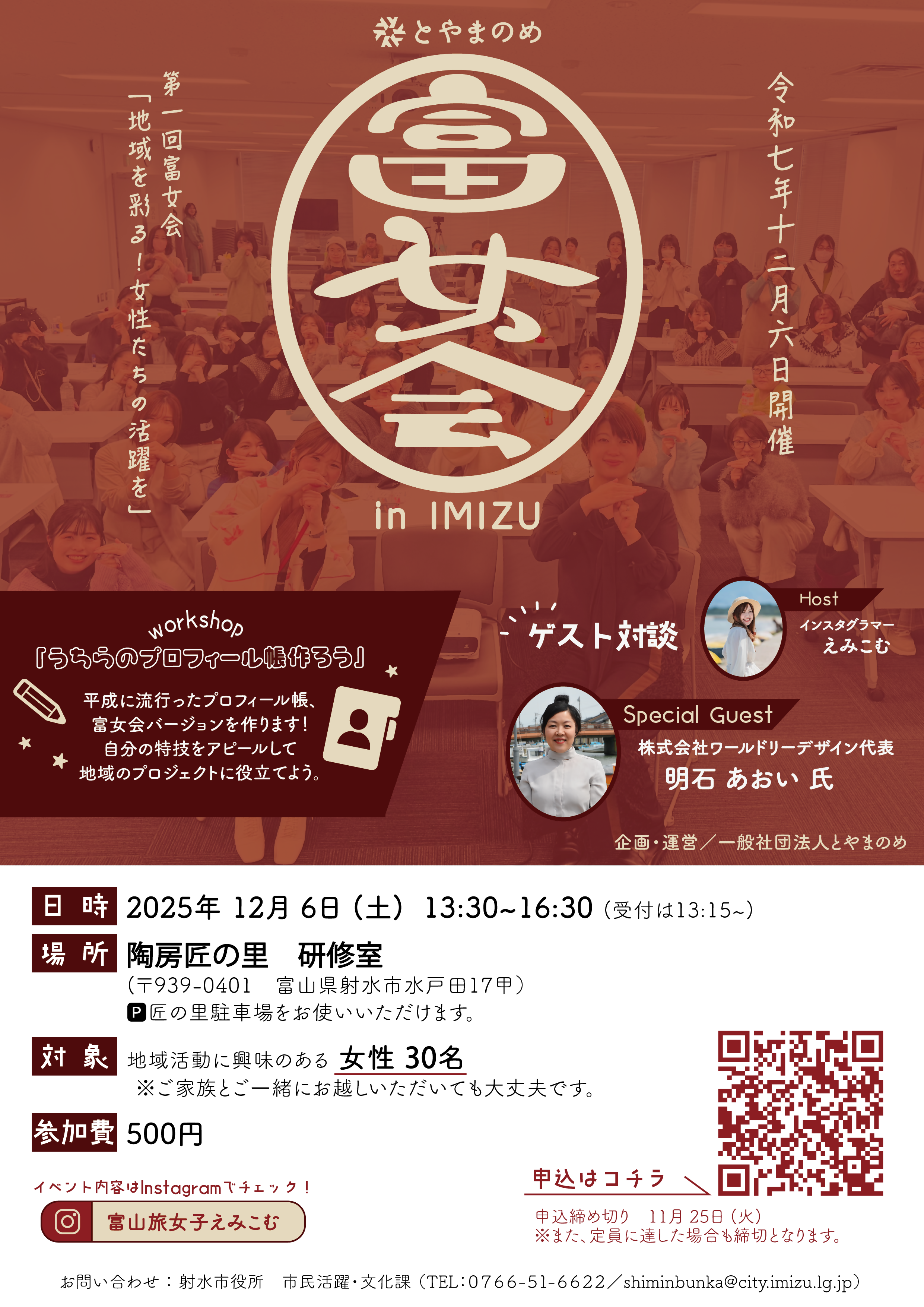 女性活躍推進セミナー「富女会 in IMIZU」参加者募集! 2025年12月15日更新 シェア ポスト 開催期間:2026年2月1日 開催時間:午後1時30分開催場所:陶房匠の里費用:参加費500円 地域活動にチャレンジしたい女性を応援する「富女会 in IMIZU」を開催します! 富山旅女子として活躍するインスタグラマーのえみこむさんをホストに迎え、市内外で活躍している女性に、自らの体験や活動、これからの夢などをお話いただき、地域活動にチャレンジしたい女性を応援するワークショップを開催します。 自身の“好き”を活かした活動を考えている方や、射水市内の取り組みに興味がある方、また、「地域活動は知らないけど、なんだか面白そう!!」と思った方など・・・気軽に参加できるセミナーです!! 富女会 in IMIZU ホスト(講師・進行) インスタグラマー えみこむ さん 2021年からInstagramアカウント「富山旅女子emicom」にて富山観光の紹介や富山の楽しみ方を発信。 富山のお店や企業のPR活動の他、テレビ・動画出演、SNSセミナーなど幅広く活動しています。 また、舟橋村にできた保育料無料のまったく新しい仕組みの学童保育fork toyamaの広報を担当、施設内カフェnokiの店長もしています。 地域活性化に取り組む団体、一般社団法人とやまのめの理事に就任し、SNSを活かして若者のコミュニティづくりや「富山の楽しみを"つくる"」イベントの企画運営を行っています。 第2回「PR力を武器に自分の取り組みを発信しよう!」 ●えみこむが教えるPR力講座 & ワークショップ ワークショップを踏まえて自己紹介をしよう 女性目線の意見や提案をグループごとに考え、発表しよう 開催日時・場所等 日 時 令和8年2月1日(日) 13:30~15:30(受付は13:15~) 場 所 陶房匠の里 研修室(射水市水戸田17甲) 対 象 地域活動に興味のある女性30名※ ご家族とご一緒にお越しいただいても大丈夫です。 申 込 1月26日(月)締切 ※ 定員になり次第締切 参加費 500円 【企画・運営】一般社団法人とやまのめ【申し込みはこちらをクリック】 【活動終了】第1回「地域を彩る!女性たちの活躍を!」 ●ワークショップ「プロフィール帳を作ろう☆」 自分の得意なことや好きなことをプロフィールにまとめ、実際に地域のプロジェクトに役立てよう! ●対談、質問コーナー ゲスト 明石 あおい さん(株式会社ワールドリー・デザイン代表) 起業や地域活性化への取り組みについて、明石あおいさん、えみこむさんの対談日 時 令和7年12月6日(土) 13:30~16:30(受付は13:15~) 場 所 陶房匠の里 研修室(射水市水戸田17甲) 対 象 地域活動に興味のある女性30名 参加費 500円 【企画・運営】一般社団法人とやまのめ お問い合わせ 市民生活部 市民活躍・文化課 所在地:〒939-0294 射水市新開発410番地1 電話:0766-51-6622 FAX:0766-51-6654 Eメールアドレス:shiminbunka@city.imizu.lg.jp