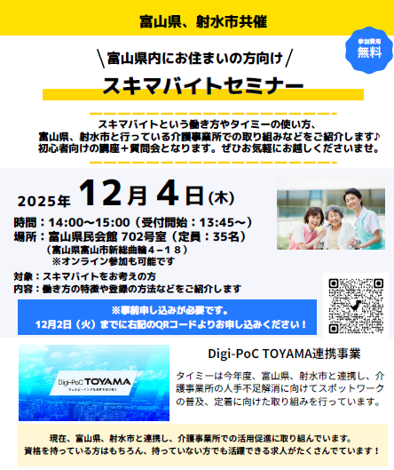 「スキマバイトセミナー」 を開催します! 2025年11月14日更新 開催期間:2025年12月4日 開催時間:14時00分から開催場所:富山県民会館 704会議室費用:無料 富山県が主催する、県民のウェルビーイング向上の実現を図るため、先進的なデジタル技術を活用して地域課題を解決する実証実験プロジェクト 「Digi-PoC TOYAMA(デジポックとやま)」 で、射水市が提出した募集テーマ「介護サービスの担い手確保と負担軽減」に、株式会社タイミー様の提案が採択され、令和7年12月まで、実証実験を展開しています。 この実証実験の概要は、「介護分野向けの業務の切り出し支援や説明会の開催により、スポットワークの普及・定着を図り、介護現場における人手確保・負担感の解消を目指す」というものです。 スポットワーク導入に向けて、働き手向けに「スキマバイトセミナー」を開催します。日 時 令和7年12月4日(木)14:00~場 所 富山県民会館702会議室(定員35名) ※ オンラインでの参加も可能です。 スキマバイトという働き方やタイミーの使い方や、富山県、射水市と行っている介護事業所での取り組みなどをご紹介します。 初心者向けの講座、質問会となります。参加無料ですのでぜひお気軽にお越しくださいませ。▼こちらの申し込みフォームから12月2日(火)までにお申し込みをお願いします。https://forms.gle/KrDWdjEjjc9Doz576 スキマバイトセミナー・チラシ PDFファイルをご覧になるには、Adobe Readerが必要です。こちらのバナーから無料でインストールできます。 お問い合わせ 福祉保健部 介護保険課 所在地:〒939-0294 射水市新開発410番地1 電話:0766-51-6627 FAX:0766-51-6666 Eメールアドレス:kaigo@city.imizu.lg.jp