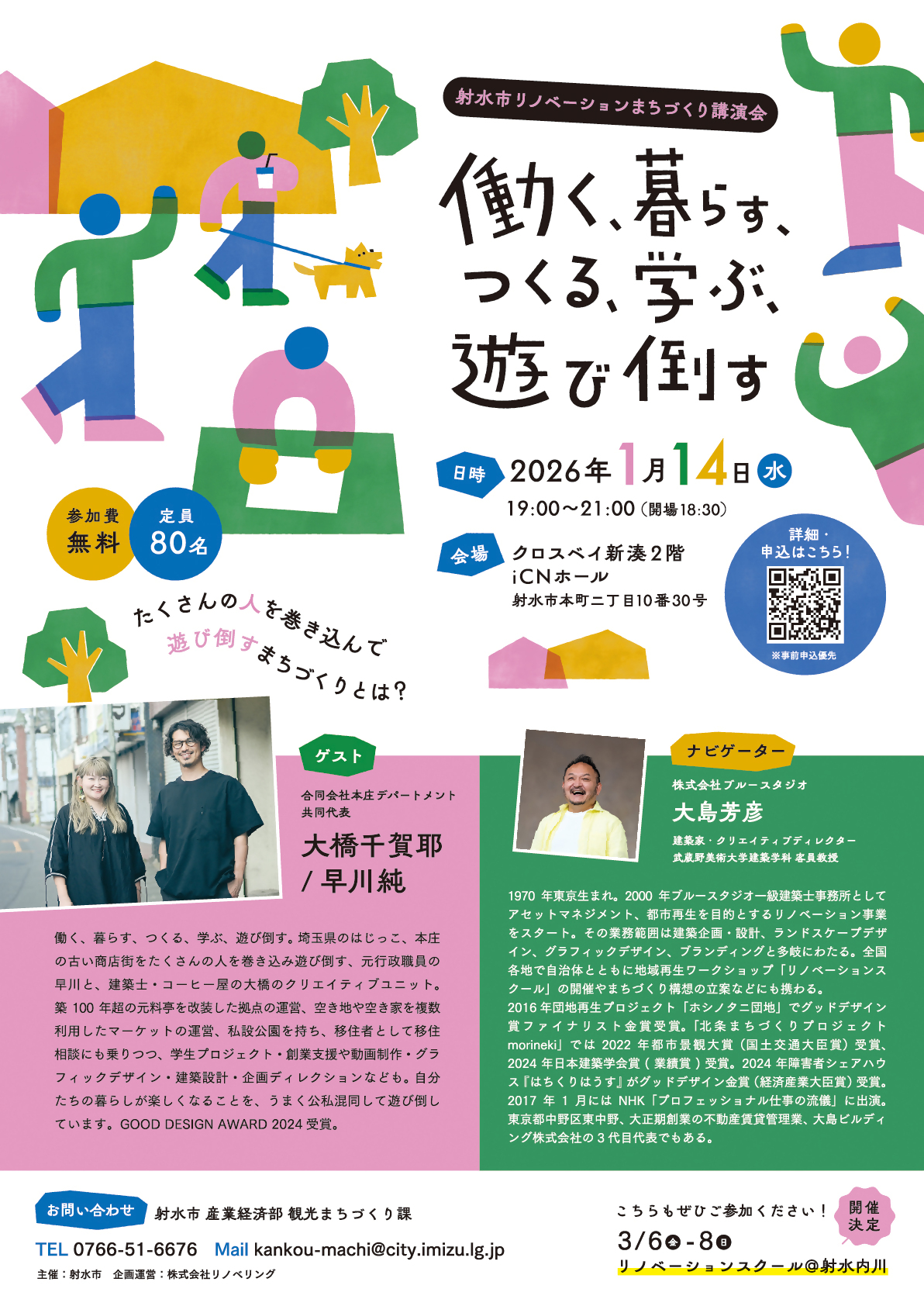 射水市リノベーションまちづくり講演会を開催します! 2025年12月10日更新 シェア ポスト 開催期間:2026年1月14日 開催時間:19:00~21:00開催場所:クロスベイ新湊 2階iCNホール 「働く、暮らす、つくる、遊び倒す」大橋千賀耶さん・早川純さん講演会 射水市では、内川周辺エリアをはじめとして、近年、空き家や空き店舗などを活用して、新規出店されるケースが増えてきており、こうした流れを一層促進して、新しいまちのコンテンツ(ビジネスやプロジェクト)が連鎖的に生まれ、地域課題の解決に結びつけていく取組を進めようと考えています。 今回は、埼玉県本庄市で取組を行っている本庄デパートメントの大橋千賀耶さん・早川純さんをお呼びして、「まちを遊び倒す」取り組みから、空き家を使ってまちの機能を取り戻す方法や、まちで暮らしながら働くことの可能性についてご講演していただきます。 皆さまのご参加、お待ちしております! なお、3月6日(金)から8日(日)までの3日間で「リノベーションスクール@射水内川」を開催します。詳細は、後日お知らせします。 こんな人にオススメ! ・リノベーションやまちづくりに興味関心のある方、取り組んでみたい方・創業に興味があり、自ら実践者となってまちと関わりを持ったビジネスを興し、稼ぎながらまちに貢献したい方・建築業やデザイナークリエイターなど自分のスキルを生かして、まちに貢献したい方・ワクワクすることが好きな方、新しいことが好きな方、今の暮らしをもっと良くしたいという向上心のある方・「リノベーションスクール@射水内川」への参加を検討されている方など 講演会の概要・参加方法について 【日時】 1月14日(水)19時00分~21時00分 【開催場所】 クロスベイ新湊 2階iCNホール(射水市本町二丁目10番30号) ※4時間まで駐車場無料 【定員】 80名(参加費無料)※事前に申込みをお願いします。 事前申込みは こちら 当日参加も可能ですが、定員に達した場合は、事前に申込みをされた方を優先させていただきます。 【企画運営】 株式会社リノベリング ゲスト 大橋千賀耶さん/早川純さん(合同会社本庄デパートメント共同代表) 【大橋千賀耶さん】1986年東京都生まれ、北海道札幌育ち。武蔵野美術大学卒業後、一級建築士事務所co-designstudioにて住宅・店舗設計に従事しながら2016年に独立。個人での建築設計・デザイン業、コーヒーとクリームソーダ屋としてのキャリアをスタート。二地域居住を経て、2019年に古くて可愛い建物が並ぶ商店街によだれがとまらず、埼玉県本庄市に移住。築80年の長屋をDIYしながら商店街暮らしを楽しんでいる。 【早川純さん】1985年群馬県太田市生まれ。東京23区と群馬県の役所をお腹いっぱい経験して2021年独立。独立前は働きながら無理して大学院に通い、やめとけばよかったと後悔しながらも、事業の基礎をつくる。2年間、シンクタンクで住民の幸福度研究に取り組んだことがあり、自身の幸せに向き合った結果が今の姿。平井堅さんに似ていると言われ20年経つが、期待されるほど歌は上手くない。写真家、動画クリエイター、公園管理者、埼玉県商店街支援専門家、東洋PPP研究センターリサーチパートナーと肩書ばかりが増えているのは、1つのことを続けていられない飽きっぽい性格だから。 【本庄デパートメント】働く、暮らす、つくる、学、遊び倒す。埼玉県のはじっこ、本庄の古い商店街をたくさんの人を巻き込み遊び倒す、元行政職員の早川と、建築士・コーヒー屋の大橋のクリエイティブユニット。築100年超の元料亭を改装した拠点の運営、空き地や空き家を複数利用したマーケットの運営、私設講演を持ち、移住者として移住相談にも乗りつつ、っ学生プロジェクト・創業支援や動画制作・グラフィックデザイン・建築設計・企画ディレクションなども。自分たちの暮らしが楽しくなることを、うまく公私混同して遊び倒しています。GOOD DESIGN AWARD 2024受賞。 モデレーター 大島芳彦さん 株式会社ブルースタジオ、建築家・クリエイティブディレクター、武蔵野美術大学建築学科 客員教授 【プロフィール】 1970年東京生まれ。2000年ブルースタジオ一級建築士事務所としてアセットマネジメント、都市再生を目的とするリノベーション事業をスタート。その業務範囲は建築企画・設計、ランドスケープデザイン、グラフィックデザイン、ブランディングと多岐にわたる。全国各地で自治体とともに地域再生ワークショップ「リノベーションスクール」の開催やまちづくり構想の立案などにも携わる。2016年団地再生プロジェクト「ホシノタニ団地」でグッドデザイン賞ファイナリスト金賞受賞。「北条まちづくりプロジェクト morineki」では2022年都市景観大賞(国土交通大臣賞)受賞、2024年日本建築学会賞(業績賞)受賞。2024年障害者シェアハウス『はちくりはうす』がグッドデザイン金賞(経済産業大臣賞)受賞。2017年1月にはNHK「プロフェッショナル仕事の流儀」に出演。東京都中野区東中野、大正期創業の不動産