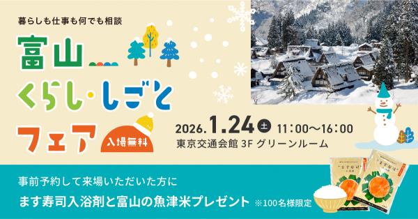 第3回富山くらし・しごとフェアに出展します! 2026年1月9日更新 シェア ポスト 開催期間:2026年1月24日 開催時間:11時00分~16時00分開催場所:東京交通会館3F グリーンルーム費用:無料(事前申込みをおススメします) 東京で開催!富山への移住フェアに射水市も参加します! 都会の暮らしもいいけれど、そろそろ「ちょうどいい暮らし」見つけませんか?射水市を含む、富山県内10市町が参加する大相談会です。富山県への移住をお考えの方や、地方暮らしに興味がある方など、どなたでもお気軽にお越しください。映画やドラマの舞台にもなった美しい水辺のまち・射水市。海・里山・まちのバランスがちょうどよく、移住先として今、大注目のエリアです。当日は、移住・仕事・空き家のことなど何でも相談OK!地域おこし協力隊、市職員が、リアルな暮らしをご紹介します! 開催概要 [開催日時] 2026年1月24日(土)11:00~16:00 [開催場所] 東京交通会館3F グリーンルーム 東京都千代田区有楽町2-10-1 [参加費] 無料(詳細・申し込みは公式ホームページから) ※ 事前の来場予約でプレゼントがもらえます。 [主催] 「くらしたい国、富山」推進本部 [共催] 公益社団法人 ふるさと回帰・移住交流推進機構 [お問合せ] 富山県 地方創生局 ワンチームとやま推進室 中山間地域支援・移住促進課 TEL:076-444-4496 当日の内容 移住・仕事相談コーナー県移住相談員が幅広い相談に対応します。 市町コーナー市町職員と対面で相談できます。 移住者コーナー先輩移住者が富山暮らしの魅力をお伝えします。 セミナーコーナー移住者のリアルな話が聞けます。 お問い合わせ 富山県 地方創生局 ワンチームとやま推進室 中山間地域支援・移住促進課 電話:076-444-4496