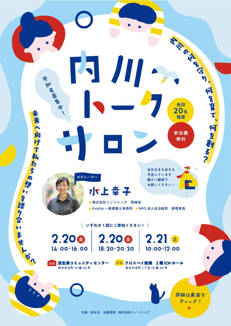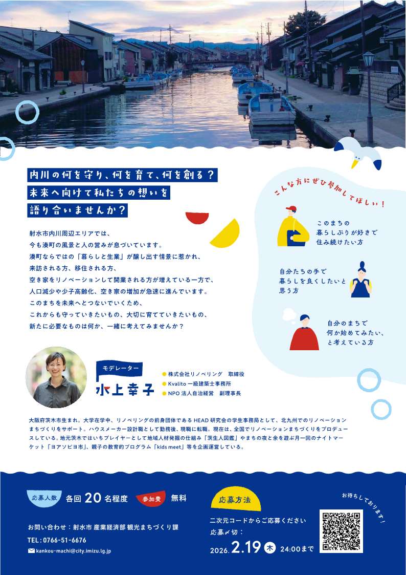 内川トークサロンを開催します! 2026年2月3日更新 シェア ポスト 開催期間:2026年2月20日から2月21日まで 費用:無料 内川トークサロン ~内川の何を守り、何を育て、何を創る? 未来へ向けて私たちの想いを語り合いませんか?~ 射水市内川周辺エリアでは、今も湊町の風景と人の営みが息づいています。 湊町ならではの「暮らしと生業」が醸し出す情景に惹かれ、来訪される方、移住される方、空き家をリノベーションして開業される方が増えている一方で、人口減少や少子高齢化、空き家の増加が急速に進んでいます。 このまちを未来へとつないでいくため、これからも守っていきたいもの、大切に育てていきたいもの、新たに必要なものは何か、一緒に考えてみませんか? ☆このまちの暮らしぶりが好きで住み続けたい方 ☆自分たちの手で暮らしをよくしたいと思う方 ☆自分のまちで何か始めてみたい、と考えている方 など 皆さまのご参加をお待ちしてます! 概要 【日時】 【場所】 ① 2026年2月20日(金)14:00-16:00(開場 13:30) 放生津コミュニティセンターあゆの風センターホール(射水市立町10番20号) ② 2026年2月20日(金)18:30-20:30(開場 18:00) 放生津コミュニティセンターあゆの風センターホール(射水市立町10番20号) ③ 2026年2月21日(土)10:00-12:00(開場 9:30) クロスベイ新湊2階iCNホール(射水市本町二丁目10番30号) ※①から③まででご都合の良い日時に1回ご参加ください。 【参加費】 無料 【定員】 各回20名程度(事前申込制) 事前の申込みをお願いします。お申込みは こちら ※当日参加も可能ですが、定員に達した場合は、事前に申込みをされた方を優先させていただきます。 【企画運営】 株式会社リノベリング モデレーター 水上幸子さん 株式会社リノベリング 取締役/Kvalito 一級建築士事務所/NPO 法人自治経営 副理事長 【プロフィール】 大阪府茨木市生まれ。大学在学中、リノベリングの前身団体であるHEAD 研究会の学生事務局として、北九州でのリノベーションまちづくりをサポート。ハウスメーカー設計職として勤務後、現職に転職。現在は、全国でリノベーションまちづくりをプロデュースしている。 地元茨木ではいちプレイヤーとして地域人材発掘の仕組み「茨生人図鑑」やまちの夜と余を遊ぶ月一回のナイトマーケット「ヨアソビヨ市」、親子の教育的プログラム「kids meet」等を企画運営している。 お問い合わせ 産業経済部 観光まちづくり課 所在地:〒934-0011 射水市本町二丁目13番1号 電話:0766-51-6676 FAX:0766-82-7874 Eメールアドレス:kankou-machi@city.imizu.lg.jp