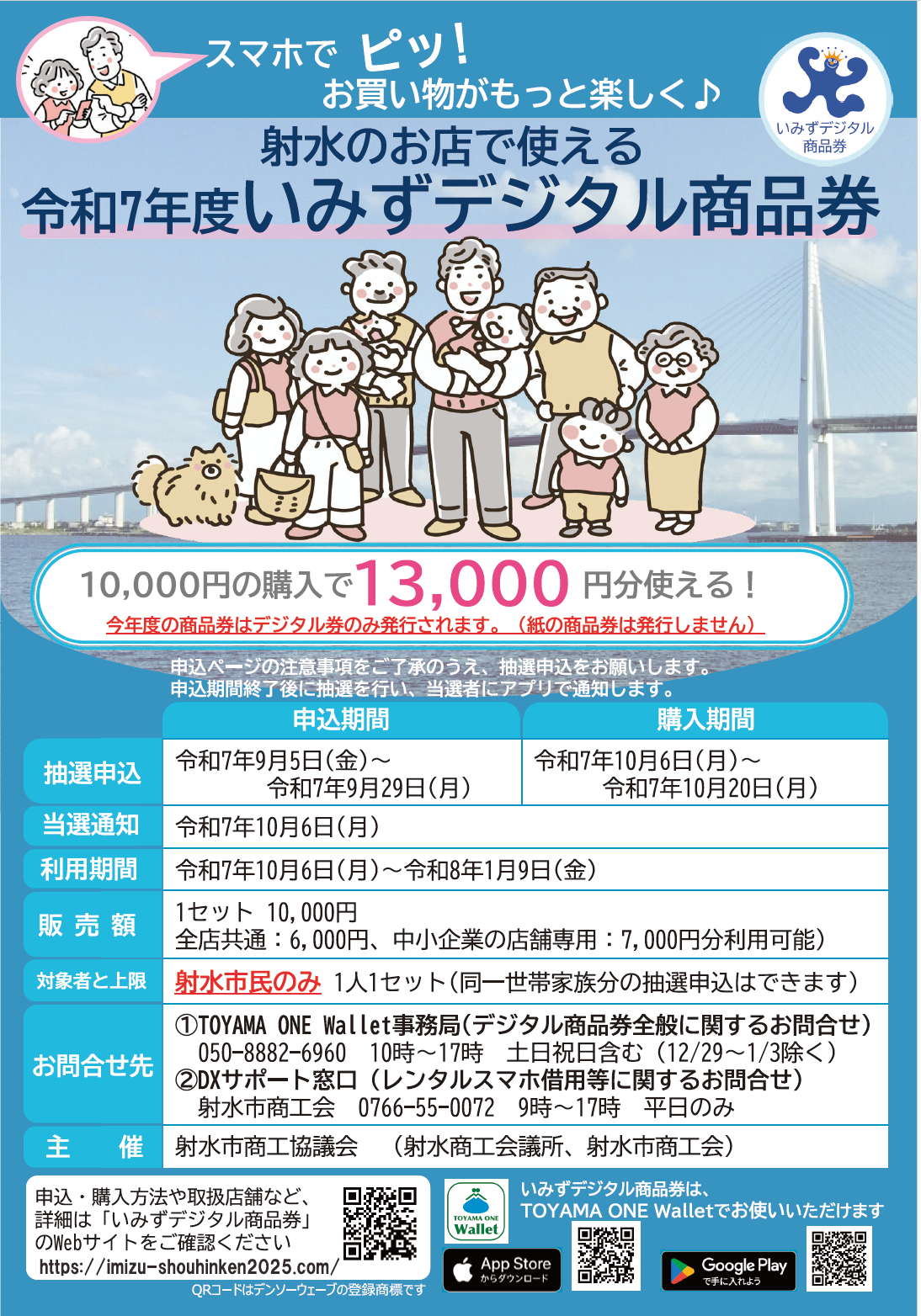 【9/29申込〆】プレミアム付きデジタル商品券「いみずデジタル商品券」 2025年9月19日更新 シェア ポスト 射水市商工協議会では、物価高騰の影響を受けている市民生活を支援するため、プレミアム付きデジタル商品券「いみずデジタル商品券」事業を実施します。 事業概要 ・販売口数 25,000セット・プレミアム率30% 10,000円の購入で13,000円分使えます。・一人1セットまで。 同一世帯家族分をまとめて申し込むことも可能です。 【申込条件】射水市在住の方【申込期間】令和7年9月5日(金)~9月29日(月)※抽選です【抽選結果】令和7年10月6日(月)【購入期間】令和7年10月6日(月)~10月20日(月)【利用期間】令和7年10月6日(月)~令和8年1月9日(金)【購入方法】クレジットカード、コンビニ、セブン銀行ATM チラシ・専用HP 詳しくはチラシ及び専用HPを参照ください。 【専用HP】いみずデジタル商品券 (imizu-shouhinken2025.com) DXサポート窓口について 高齢者やデジタルに不慣れな方へきめ細やかなフォローを行うDXサポート窓口を設置します。 【設置期間】令和7年9月5日(金)~令和7年10月20日(月)※予定 【サポート内容】高齢者やキャッシュレスに不慣れな方を対象に、いみずデジタル商品券の使用方法等を説明します。 スマートフォンをお持ちでなく、かつ抽選申込に当選された方(※)にはレンタルスマホの貸出を実施します。 ※事前に申込書の提出が必要です。詳細はチラシをご確認ください。【窓口設置場所】射水市商工会、射水商工会議所 お問い合わせ先 【商品券に関するお問い合わせ】 専用コールセンター 050-8882-6960 (受付時間:10時~17時 ※12/29~1/3除く) 【DXサポート窓口(レンタルスマホ)に関するお問い合わせ】 射水市商工会 0766-55-0072 (受付時間:9時~17時 平日のみ) PDFファイルをご覧になるには、Adobe Readerが必要です。こちらのバナーから無料でインストールできます。
