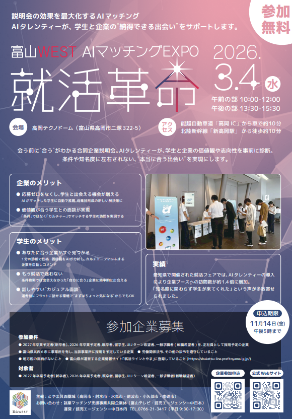 合同企業説明会「富山WEST AIマッチングEXPO 就活革命」に出展する企業を募集します