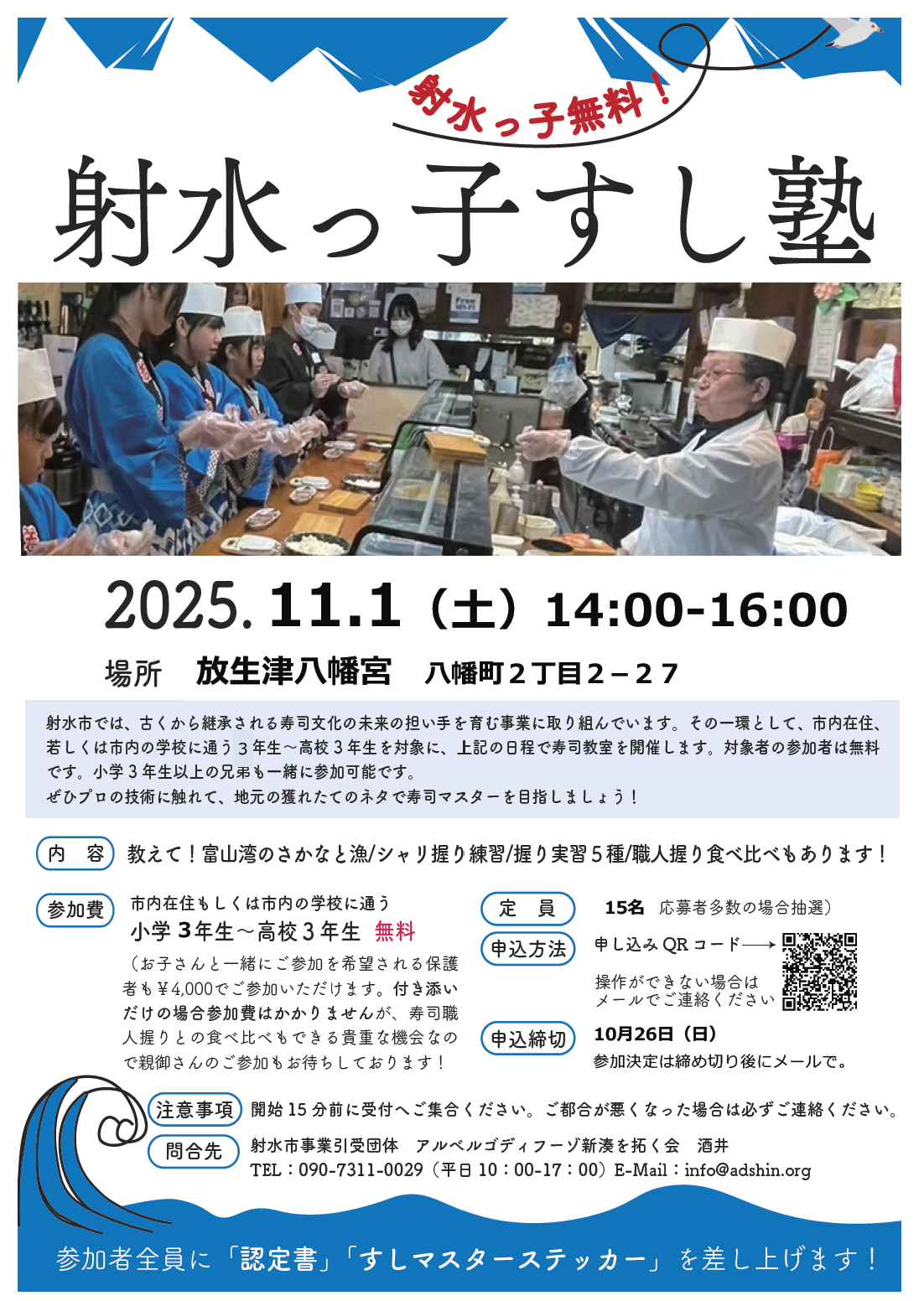 『射水っ子すし塾』開催 参加者募集中! 2025年10月10日更新 シェア ポスト 「射水っ子すし塾」の参加者を募集します! 射水市では古くから継承される寿司文化の未来の担い手を育む事業に取り組んでいます。その活動の一環として、市内在住もしくは市内の学校に通う小学3年生~高校3年生を対象に、以下の日程で寿司教室を開催します。ぜひプロの技術に触れて、地元の獲れたてのネタで寿司マスターを目指しましょう! 開催日時 令和7年11月1日(土) 14時~16時 開催場所 放生津八幡宮 (射水市八幡町2丁目2ー27) 対象者 市内在住もしくは市内の学校に通う小学3年生~高校3年生 ※小学3年生以上の兄弟姉妹も参加可能 会費 無料 ※保護者の方も一緒に参加可能です。(参加費 4,000円) 付き添いのみの場合は、参加費はかかりません。 募集定員・申込方法 申込締切:10月26日(日) 募集定員:15名 ※申込多数の場合は抽選 申込方法:以下チラシのQRコードからお申し込みください。 問合せ先 アルベルゴディフーゾ新湊を拓く会TEL:090-4308-3481(平日10:00-17:00)MAIL:ads.k.sakai@gmail.com PDFファイルをご覧になるには、Adobe Readerが必要です。こちらのバナーから無料でインストールできます。