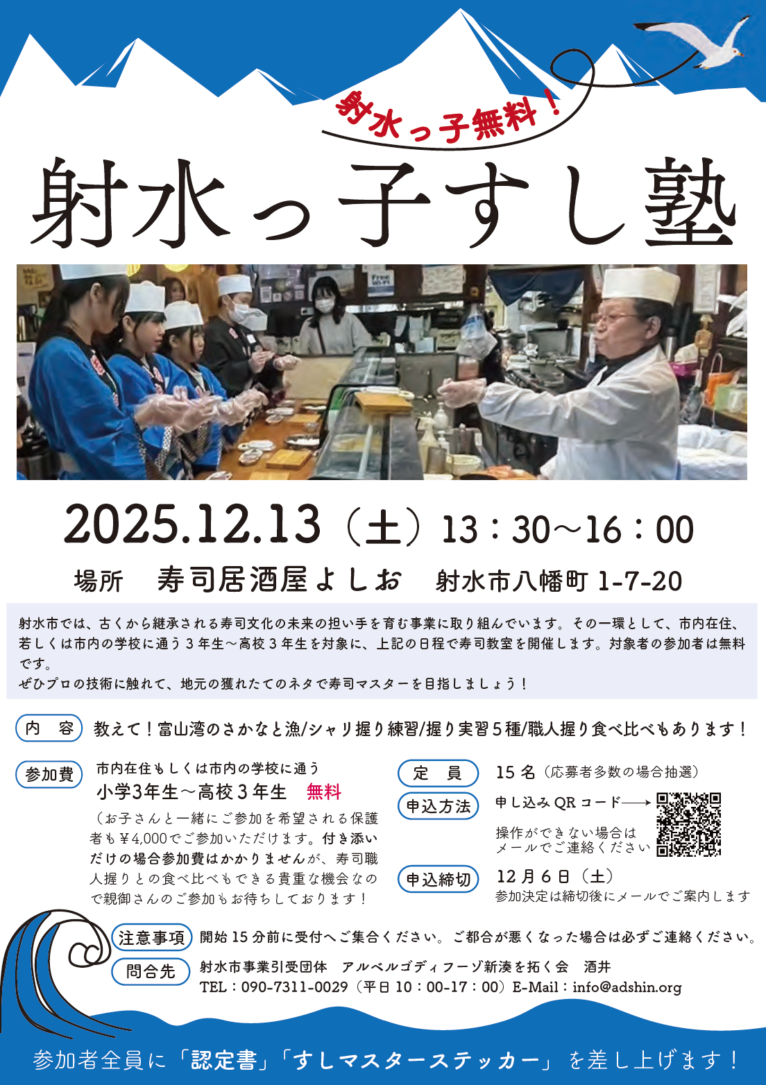 『射水っ子すし塾』開催 参加者募集中! 2025年11月17日更新 シェア ポスト 「射水っ子すし塾」の参加者を募集します! 射水市では古くから継承される寿司文化の未来の担い手を育む事業に取り組んでいます。その活動の一環として、市内在住もしくは市内の学校に通う小学3年生~高校3年生を対象に、以下の日程で寿司教室を開催します。ぜひプロの技術に触れて、地元の獲れたてのネタで寿司マスターを目指しましょう! 開催日時 令和7年12月13日(土) 13時30分~16時 開催場所 寿司居酒屋よしお (射水市八幡町1ー7ー20) 対象者 市内在住もしくは市内の学校に通う小学3年生~高校3年生 会費 無料 ※保護者の方も一緒に参加可能です。(参加費 4,000円) 付き添いのみの場合は、参加費はかかりません。 募集定員・申込方法 申込締切:12月6日(土) 募集定員:15名 ※申込多数の場合は抽選 申込方法:以下チラシのQRコードからお申し込みください。 問合せ先 アルベルゴディフーゾ新湊を拓く会TEL:090-7311-0029(平日10:00-17:00)MAIL:info@adshin.org PDFファイルをご覧になるには、Adobe Readerが必要です。こちらのバナーから無料でインストールできます。