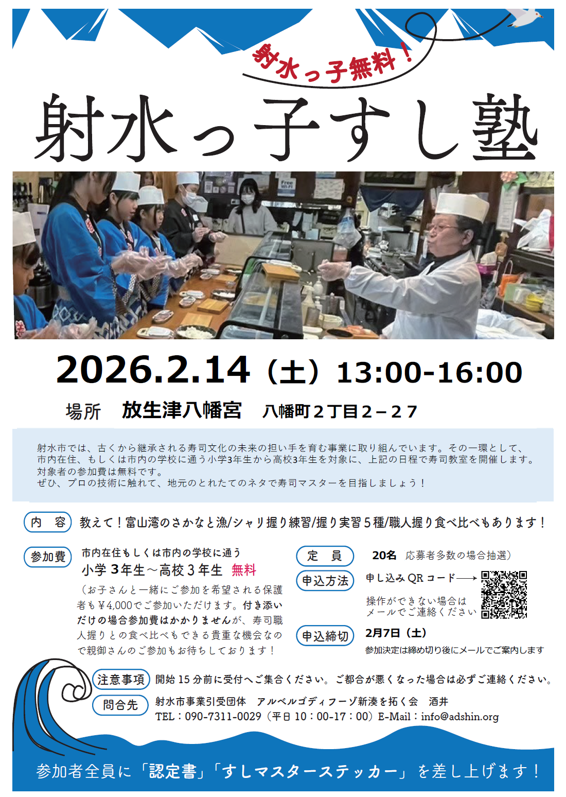 『射水っ子すし塾』開催 参加者募集中! 2026年1月26日更新 シェア ポスト 「射水っ子すし塾」の参加者を募集します! 射水市では古くから継承される寿司文化の未来の担い手を育む事業に取り組んでいます。その活動の一環として、市内在住もしくは市内の学校に通う小学3年生~高校3年生を対象に、以下の日程で寿司教室を開催します。ぜひプロの技術に触れて、地元の獲れたてのネタで寿司マスターを目指しましょう! 開催日時 令和8年2月14日(土) 13時~16時 開催場所 放生津八幡宮 (射水市八幡町2丁目2-27) 対象者 市内在住もしくは市内の学校に通う小学3年生~高校3年生 会費 無料 ※保護者の方も一緒に参加可能です。(参加費 4,000円) 付き添いのみの場合は、参加費はかかりません。 募集定員・申込方法 申込締切:2月7日(土) 募集定員:20名 ※申込多数の場合は抽選 申込方法:以下チラシのQRコードからお申し込みください。 問合せ先 アルベルゴディフーゾ新湊を拓く会TEL:090-7311-0029(平日10:00-17:00)MAIL:info@adshin.org PDFファイルをご覧になるには、Adobe Readerが必要です。こちらのバナーから無料でインストールできます。