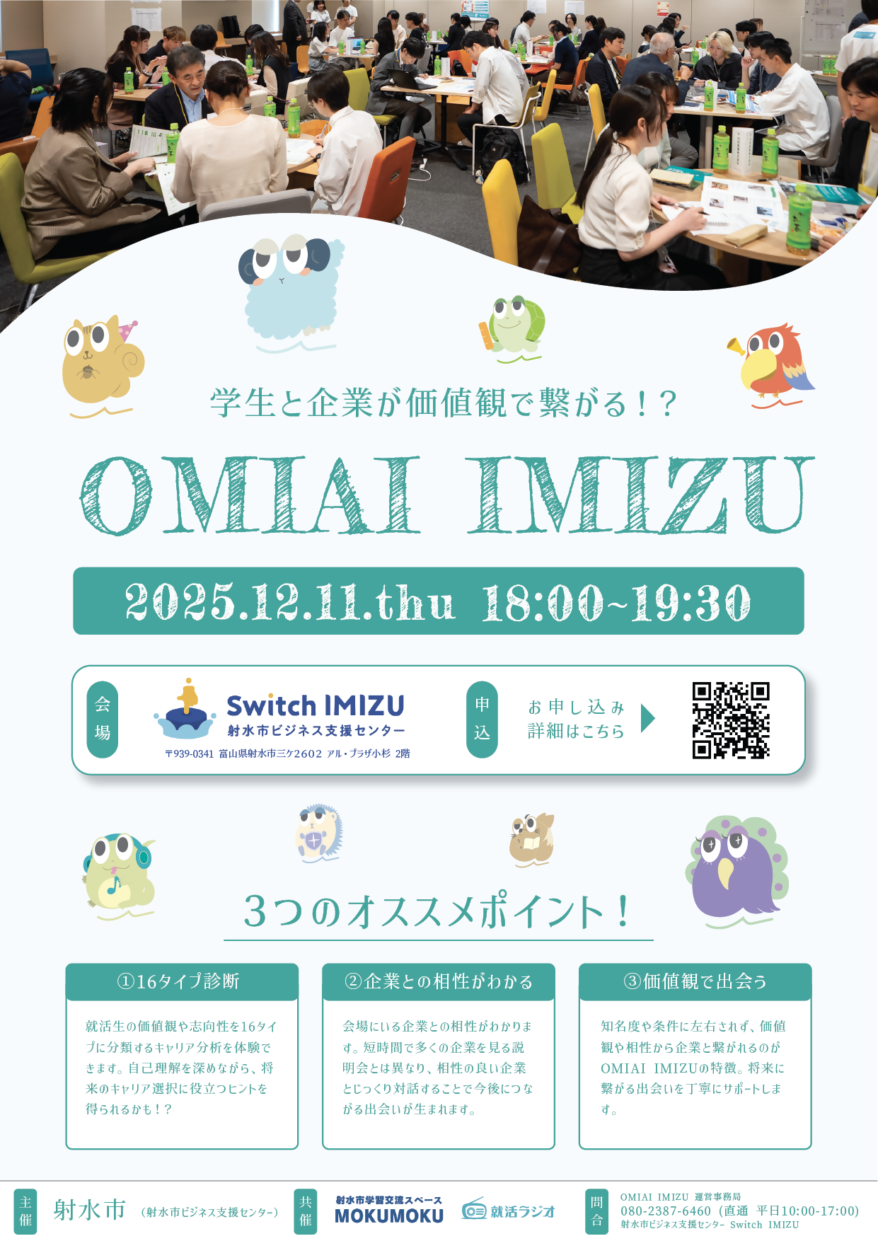 射水市ビジネス支援センター 12月開催イベントについて 2025年12月3日更新 シェア ポスト 『学生と企業が価値観でつながる!?「OMIAI IMIZU」』 イベント概要 「自分に合う会社って、どこだろう?」そんなモヤモヤを感じている人へ。《OMIAI IMIZU》は、企業と学生が“価値観”でつながる就活イベントです。面接ではなく、フランクな交流なので、リアルな声を聞けます。「この会社、なんかいい!」が実感できるチャンスです。学生の皆さん、ぜひご参加ください! 日 時 12月11日(木) 18:00-19:30(受付開始時間:17:30)場 所 アル・プラザ小杉2F @Switch IMIZU対象者 射水市での就職に興味がある2027年度卒業予定の大学・専門・短大・高専生 ※定員20名参 加 無料 ▼イベントページはこちら▼ https://www.shukatsuradio.com/omiai-imizu お申込み 以下からお申し込みください。https://forms.gle/3SLjBavARBe5vwrk6 Switch IMIZUイベント情報 その他イベント情報や過去のイベント情報はSwitch IMIZUホームページをご覧ください。