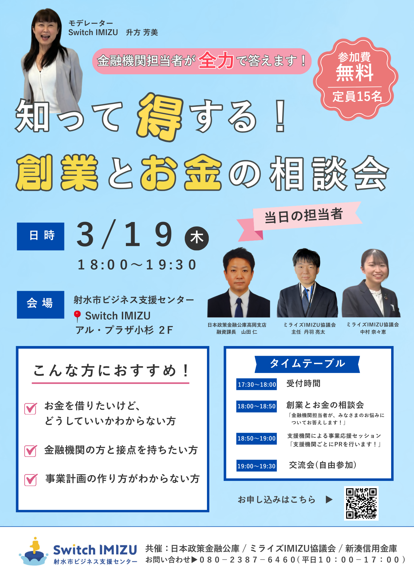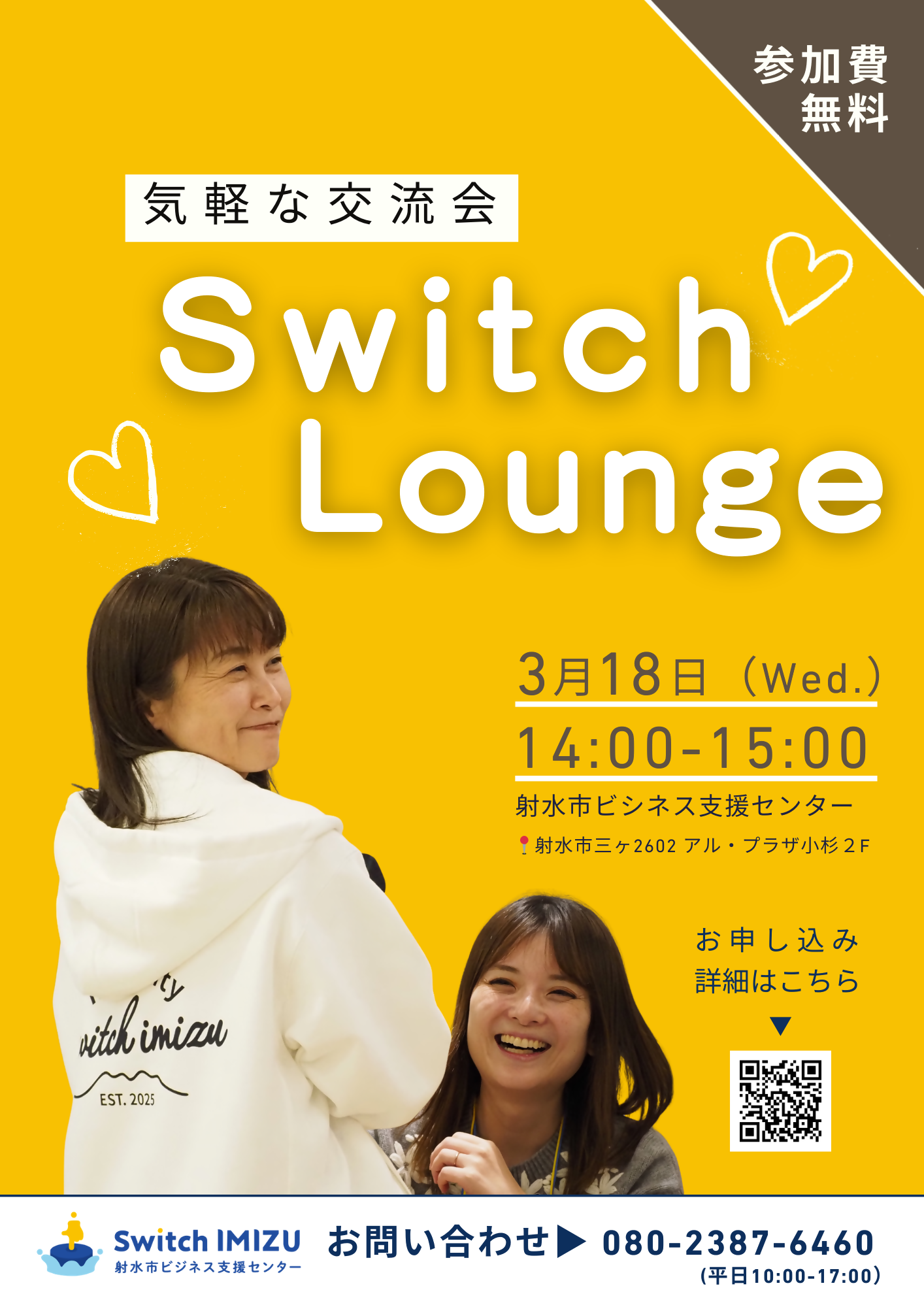 射水市ビジネス支援センター 3月開催イベントについて 2026年3月3日更新 シェア ポスト 気軽な交流会 Switch Lounge 「起業に興味はあるけれど、何から始めていいかわからない」「やりたいことはあるけれど、誰かにちょっと背中を押してほしい」「一人で考えていると行き詰まってしまう……」 そんな想いをお持ちの方、まずは「Switch Lounge」で気軽におしゃべりしませんか? 【日時】3月18日(水)14:00 - 15:00【会場】射水市ビジネス支援センター「Switch IMIZU」(アルプラザ小杉2階) こんな方におすすめ! ・起業の第一歩をどう踏み出すか迷っている方 ・自分のアイデアを誰かに聞いてもらいたい方 ・同じように頑張る仲間とつながりたい方 ・とにかく楽しくおしゃべりしたい! ・刺激を受けたい方 ▼お申し込みはこちらから▼https://forms.gle/kRJCjmiNqwSQhK1m9 知って得する!創業とお金の相談会 「創業したいけれど、資金調達はどうすればいい?」 「金融機関の方と話をしたいけれど、少しハードルが高い……」 「事業計画書の作り方が分からず、足踏みしている」 そんな悩みをお持ちの方へ。 金融機関の担当者がみなさまの疑問に全力で答える!「知って得する!創業とお金の相談会」を開催いたします。 【日時】3月19日(水)18:00-19:30(受付:17:30~)【会場】射水市ビジネス支援センター「Switch IMIZU」(アル・プラザ小杉2F) こんな方におすすめ! ・お金を借りたいけれど、どうしていいかわからない方 ・金融機関の方と接点を持ちたい方 ・事業計画の作り方がわからない方 ▼お申し込みはこちらから▼https://forms.gle/N7t2Z19yQah53tkB9 Switch IMIZUイベント情報 その他イベント情報や過去のイベント情報はSwitch IMIZUホームページをご覧ください。