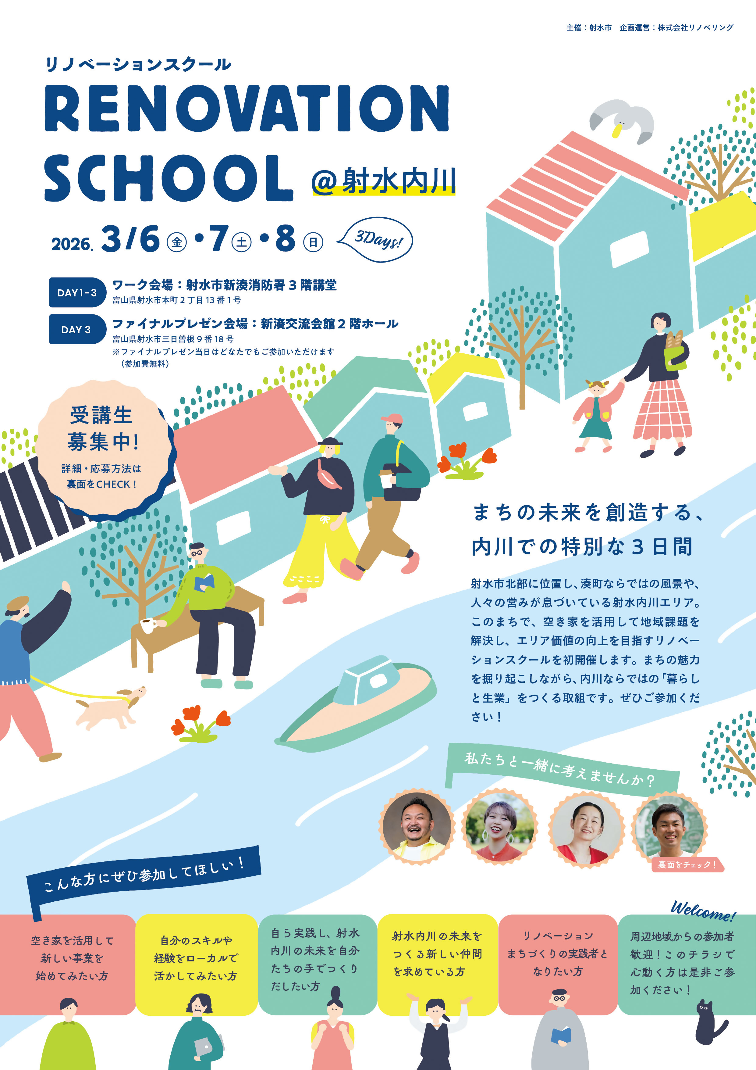 「リノベーションスクール@射水内川」 を開催します 2025年12月18日更新 シェア ポスト \\リノベーションスクール@射水内川を開催します// 射水市では、内川周辺エリアをはじめとして、近年、空き家や空き店舗などを活用して、新規出店されるケースが増えてきており、こうした流れを一層促進して、新しいまちのコンテンツ(ビジネスやプロジェクト)が連鎖的に生まれ、地域課題の解決に結びつけていく取組を進めています。 今回は、令和8年3月6日(金)から8日(日)までの3日間、内川エリアで空き家を活用して地域課題を解決し、エリア価値の向上を目指す”リノベーションスクール”を開催します。まちの魅力を掘り起こしながら、内川ならではの「暮らしと生業」をつくる取組です。 【こんな方にぜひ参加してほしい!】 ☆空き家を活用して新しい事業を始めてみたい方 ☆自分のスキルや経験をローカルで生かしてみたい方 ☆自ら実践し、射水内川の未来を自分たちの手でづくりだしたい方 ☆射水内川の未来をつくる新しい仲間を求めている方 ☆リノベーションまちづくりの実践者となりたい方 など ※周辺地域からの参加者も歓迎! ぜひ、みなさんのご参加をお待ちしております。 また、最終日(3/8)のファイナルプレゼンテーション&クロージングアクトはどなたでも参加できます。 リノベーションスクールとは 遊休不動産を活用して新たなコンテンツを生み出し、その事業化を目指す短期集中・実践型スクールです。様々な業種・職種の方々が受講生として参加し、ユニットと呼ばれるグループに分かれて、実在する空き家・空き店舗を対象に、3日間かけて利活用案/リノベーションプラン/事業計画などを作成。最終日は、それを公開の場で発表します。各ユニットには既に全国各地で実践を繰り返しているユニットマスターが入り、そのブラッシュアップをお手伝いします。 リノベーションスクール講師紹介 スクールマスター大島芳彦さん 【プロフォール】 株式会社ブルースタジオ 建築家・クリエイティブディレクター 武蔵野美術大学建築学科 客員教授 1970年東京生まれ。2000年ブルースタジオ一級建築士事務所としてアセットマネジメント、都市再生を目的とするリノベーション事業をスタート。その業務範囲は建築企画・設計、ランドスケープデザイン、グラフィックデザイン、ブランディングと多岐にわたる。全国各地で自治体とともに地域再生ワークショップ「リノベーションスクール」の開催やまちづくり構想の立案などにも携わる。2016年団地再生プロジェクト「ホシノタニ団地」でグッドデザイン賞ファイナリスト金賞受賞。「北条まちづくりプロジェクトmorineki」では2022年都市景観大賞(国土交通大臣賞)受賞、2024年日本建築学会賞(業績賞)受賞。2024年障害者シェアハウス『はちくりはうす』がグッドデザイン金賞(経済産業大臣賞)受賞。2017年1月にはNHK「プロフェッショナル仕事の流儀」に出演。東京都中野区東中野、大正期創業の不動産賃貸管理業、大島ビルディング株式会社の3代目代表でもある。一社)リノベーション協議会 理事副会長。一社)日本まちやど協会 理事 他。 ユニットマスター西山芽衣さん 【プロフォール】 株式会社マイキー ディレクター群馬県出身、千葉市在住。千葉大学で建築を学んだあと、まちづくり会社を経て、西千葉で「HELLO GARDEN」「西千葉工作室」「子ども創造室」等の企画・立ち上げを行う。企画・コンテンツ開発・アートディレクション・人材育成など幅広いスキルを活かして、広場や公共施設の立ち上げにも関わり、日本全国で人の日常の舞台となる場づくりと人々の創造的な活動のサポートに取り組む。「千葉国際芸術祭2025」ジェネラルプロデューサーも務める。 ユニットマスター柿原優紀さん 【プロフォール】 tarakusa株式会社 代表取締役・編集ディレクターたらくさ文化旅行舎 代表・旅行業務取扱管理者英国Glasgow芸術大学を経て、京都精華大学芸術学部卒業。 出版社にて旅雑誌やライフスタイル誌の編集に携わり、国内外の取材編集に携わった後、「土地の力を守りながら育てるためのものづくり」をポリシーに制作会社を設立。旅行会社機能を併設し、日本のさまざまな地域とともにメディアの領域にとどまらない新しい地域ツーリズムの仕組みづくり、ブランディング、制作、広報を行う。 ユニットマスター丑田俊輔さん 【プロフォール】 シェアビレッジ株式会社 代表取締役ハバタク株式会社 代表取締役プラットフォームサービス株式会社 代表取締役2004年、大学在学中に千代田区の公共施設をまちづくり拠点として再生する「ちよだプラットフォームスクウェア」の創業に参画。日本IBMの戦略コンサルティングチームを経て、2010年にハバタクを創業。新しい学びのクリエイティブ集団として、国内外を舞台に様々な教育事業を展開。2014年より秋田県五城目町在住。商店街の遊休不動産を活用した遊び場「ただのあそび場」、住民参加型の小学校建設「越え