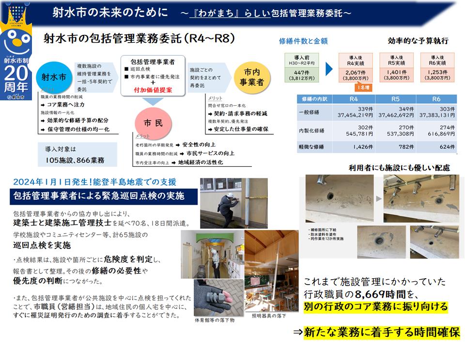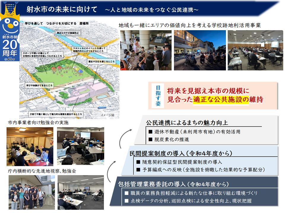 【お知らせ】射水市の公共施設マネジメントの取組が第20回JFMA賞優秀賞を受賞しました 2026年2月25日更新 シェア ポスト 本市が進めている公共施設マネジメント(FM)の取組が、公益社団法人日本ファシリティマネジメント協会(JFMA)が主催する「JFMA賞」において、優秀FM賞を受賞しました。 JFMA賞は、公共施設や建物の管理・活用に関する優れた取組を全国から選び表彰するものです。 どんな取組が評価されたの? 射水市では、人口減少や施設の老朽化が進む中でも、安全で使いやすい公共施設を将来にわたって維持していくため、次のような取組を進めています。 ①公共施設の包括管理業務 学校や保育園、文化施設などの点検・修繕・清掃などをまとめて管理する仕組みを導入しました。 これにより 施設の安全性の向上 管理の効率化 市内事業者への発注機会の拡大 職員の負担軽減 などの効果が生まれています。 ②民間提案制度の導入 民間事業者から、公共施設や公園、未利用の市有地などの活用アイデアを募集する制度を導入しています。 令和7年度からは、ソフト事業も提案対象としており、通年で提案を募集しています。 採択された提案は、市と協議を行いながら事業化されます。現在までに23件の提案を採択し、15件が実際に事業として実施されています(令和8年2月現在) 提案概要資料 ■ なぜこの取組が大切なの? 公共施設は、市民生活に欠かせない大切な財産です。しかし、人口減少や財政状況の変化により、すべての施設をこれまで通り維持することは難しくなっています。 射水市では、施設を「減らす」だけでなく、 ・安全に使い続ける・ 効率よく管理する・ 新しい価値を生み出す・ 民間の力を活かす といった考え方で、将来世代にも持続可能なまちづくりを進めています。 ■ 今後について 公共施設マネジメントは、施設の管理にとどまらず、まちの魅力向上や地域の活性化にもつながる重要な取組です。 本市では、今後も民間事業者や地域の皆さんと連携しながら、公共施設を有効に活用し、持続可能で魅力あるまちづくりを進めていきます。 ■ JFMA賞について JFMA賞は、公益社団法人日本ファシリティマネジメント協会が主催する表彰制度で、公共施設や建物の管理・活用に関する優れた取組を全国から選定し表彰するものです。 お問い合わせ 財務管理部 公共施設マネジメント推進課 所在地:〒939-0294 富山県射水市新開発410番地1 電話:0766-51-6638 FAX:0766-51-6648 Eメールアドレス:shisetsu-mg@city.imizu.lg.jp