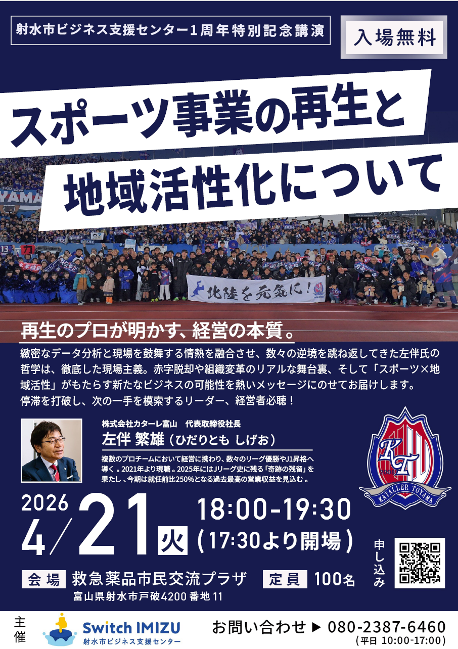射水市ビジネス支援センター 1周年特別記念講演の開催について 2026年3月23日更新 シェア ポスト スポーツ事業の再生と地域活性化について カターレ富山代表取締役社長 左伴氏から、クラブ経営や地域との連携、組織づくりについて講演していただきます。講演後はトークセッションを開催。事前・当日に寄せられた質問を交えながら、より実践的な内容をお届けします。 【日時】 4月21日(火)18:00 - 19:30【会場】 救急薬品市民交流プラザ(射水市戸破4200番地11)【対象者】市内外の経営者・事業者・市民のみなさま そのほか、スポーツビジネスや地域活性化に興味がある方、新たな挑戦を考えている方など ▼お申し込みはこちらから▼https://forms.gle/YgMvdQpTSQ79VkxKA 問合せ先 射水市ビジネス支援センター Switch IMIZU080-2387-6460(平日10:00~17:00) Switch IMIZUイベント情報 その他イベント情報や過去のイベント情報はSwitch IMIZUホームページをご覧ください。