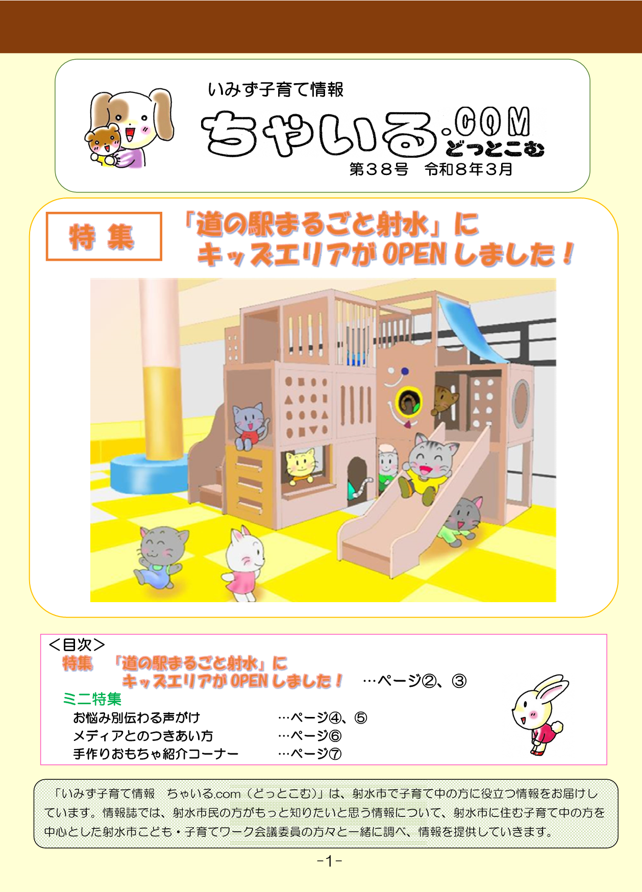 いみず子育て情報 ちゃいる.com 2026年3月31日更新 ★第38号を追加しました。 いみず子育て情報 ちゃいる.com(どっとこむ) いみず子育て情報 ちゃいる.comは、射水市こども・子育てワーク会議委員の方と身近な話題について取り上げた情報誌で、射水市で子育てしているパパ・ママの子育てのヒントになれば、という思いで発行しています。 この情報誌が、忙しい毎日の中でちょっと立ち止まり、子育ての悩みを解消し、また、子育ての喜びを実感するきっかけとなれば幸いです。 ご意見やご質問、取り上げてほしいテーマなどお待ちしております。 第38号(令和8年3月発行)特集:「道の駅まるごと射水」にキッズエリアがOPENしました!お悩み別伝わる声がけ、メディアとのつきあい方、手作りおもちゃを紹介しています。 38号 第37号(令和7年10月発行)特集:「子育て支援アプリ いみすくby母子モ」いみすくby母子モの登録方法や機能、パパの産後うつと育児、おすすめ絵本について紹介しています。 37号 第36号(令和7年3月発行)特集:「パパ・ママたちのリフレッシュ」子育て中のパパ・ママたちのリフレッシュ方法やこどもの感染症について紹介しています。 36号 第35号(令和6年10月発行)特集:「災害から身を守ろう」災害から身を守るための行動や「イヤイヤ期」の接し方について紹介しています。 35号 第34号(令和6年3月発行)特集:「産後の悩みを相談しよう」「いみずっこbabyの会」やこどもの歯磨きの仕方などを紹介しています。34号 第33号(令和5年10月発行)特集:「災害に備えよう」近年、増加している災害について防災バッグや家族ルールなどを紹介しています。 第33号 第32号(令和5年3月発行)特集:「現役ママのおはなし会」座談会を開催し、子育て中にイライラすること、うれしかったことなど、様々なテーマでお話ししてもらいました。第32号 第31号(令和4年10月発行)特集:「公園であそぼう!」射水市在住のママたちにおすすめの公園について聞いてみました!さらに、公園レポートもしてもらいました。 第31号 第30号(令和4年3月発行)特集:「パパママのこころとからだケア」子育て中のパパママが息抜きできる場所やリラックス方法、おすすめのお店をご紹介しています。第30号 第29号(令和3年10月発行)特集:「みんなどうしてる?子どもとスマホ・タブレット」お子さんのスマホ・タブレットの利用の約束や電子機器以外の遊び方について、射水市内のご家庭にインタビューしました!第29号 第28号(令和3年3月発行)特集:「子育てサークルに参加しよう!」リズム遊びや読み聞かせ、子育て相談会など、市内10か所で活動する子育てサークルをご紹介しています!第28号 第27号(令和2年10月発行)特集:「子どもとの過ごし方」子どもたちとの家での過ごし方や、家の内外問わずできるおすすめの遊び方を、射水市内のお母さんたちにインタビューしました。第27号 第26号(令和2年3月発行)特集:「家族で子育て」子育てで工夫していることや大変なことを、パパやママ、おじいちゃん・おばあちゃんそれぞれの視点からご紹介します。 第26号 第25号(令和元年10月発行)特集:「子どもの睡眠」子どもの睡眠について、ママたちの体験談や、保育士からのアドバイスを紹介します。 第25号 第24号(平成31年4月発行)特集:「みんなの卒乳」卒乳について、実際の体験談や射水市の相談窓口を紹介します。 第24号.pdf 第23号(平成30年11月発行)特集:「雨の日&雪の日を楽しもう♪」市内子育て支援センターや、お家で作れる工作の作り方について紹介します。 第23号.pdf 第22号(平成30年2月発行)特集:「ママ・パパが気になる! 保育園・幼稚園・認定こども園」子どもを入園させている保護者の方の声や、入園に関するQ&Aなどを紹介します。第22号.pdf 第21号(平成29年9月発行)特集:「キッズポートいみずに行ってみよう!」平成29年4月オープン「キッズポートいみず」内の施設を写真付きで紹介します。第21号.pdf 第20号(平成29年2月発行)特集:「新庁舎ってこんなとこ!」ママ・パパに嬉しい新庁舎の設備や、福祉医療費請求書(ピンク・みどりの用紙)に関するQ&Aなどを紹介します。 第20号.pdf第19号(平成28年9月発行)特集:「現役ママのイライラ座談会」子どもにイライラしてしまうときや、自分なりのイライラ対処法など射水市在住のママたちが本音を語ります。 第19号.pdf 第18号(平成28年2月発行)特集:「子育てわたし流」わたし時間の楽しみ方、ハローワークマザーズコーナーでの仕事さがし、仲間との子育て事例を紹介します。 第18号.pdf 第17号(平成27年9月発行) 特集:「パパ・ママのからだメンテナンス」子連れで行ける歯医者さん、美容室、骨格調整を紹介します。 第17号.pdf 第16号(平成27年2月発行) 特集:「パパ・ママを語る」夫婦で子育て・家事を楽しむコツなど、射水市在住のママたちが経験を語ります。 第16号pdf 第15号(平成26年9月発行) 特集:「なるほど!保育園・幼稚園・認定こども園」 保育園、幼稚園、認定こども園での一日の生活や平成26年度保育料などを紹介します。 第15号.pd