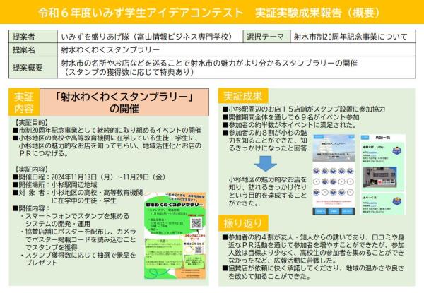 いみず学生アイデアコンテスト 2025年12月9日更新 シェア ポスト 射水市では、市の伴走支援を受けながら学生自ら企画・提案・実践に取り組み、本市の抱える地域課題の解決を目指す「いみず学生アイデアコンテスト」を開催しています。 ▼令和7年度 ▼令和6年度 ▼令和5年度 ▼令和4年度 令和7年度 実証実験成果報告会 6月に開催したプレゼンテーション審査会で優秀賞を受賞した3グループが、その後実証実験に取り組んだ成果を発表します。成果報告会をZoomウェビナーで配信しますので、ぜひご視聴ください。 ■開催日時令和7年12月12日(金)18:00~19:30 ■発表内容「ペットとつくる小杉の賑わいと共生のかたち」石黒詩歩(富山県立大学) 「ワクワク!海老江海浜公園ビーチクリーン大作戦」地域協働研究会COCOS(富山県立大学) 「内発的学び循環で未来を拓く実践型わくわくプログラミング教室」Engine(富山県立大学) ■Zoomウェビナー https://zoom.us/j/98168493873(ウェビナーID: 981 6849 3873) 実証実験成果報告会の詳細はチラシをご覧ください。令和7年度いみず学生アイデアコンテスト成果報告会チラシ コンテスト(プレゼンテーション審査会)の結果 令和7年6月29日(日)にコンテストを開催し、書類審査を通過した6件の提案の発表・審査を行いました。下記の3組が優秀賞を受賞され、今後実証実験に取り組みます。 「ペットとつくる小杉の賑わいと共生のかたち」石黒 詩歩(富山県立大学) 「ワクワク!海老江海浜公園ビーチクリーン大作戦」地域協働研究会COCOS(富山県立大学:森本 悠太、五十嵐 颯士、岸田 大志朗、松久 侑生、尾﨑 立之介、篠原 まり、鈴村 起俐、曽根 悠也、中谷 美咲、藤垣 日花里) 「内発的学び循環で未来を拓く実践型わくわくプログラミング教室」Engine(富山県立大学:鈴木 空、肥田 慶治朗) コンテスト(プレゼンテーション審査会)R7コンテスト開催チラシ アイデア募集テーマ射水市の抱える地域課題 実施要領R7コンテスト実施要領 募集チラシR7コンテスト募集チラシ 令和6年度 実証実験成果報告会 令和7年3月11日(火)に実証実験成果報告会を開催し、プレゼン審査で優秀賞を受賞した3グループが、7月から12月にかけて取り組んだ実証実験の成果を報告しました。 「射水わくわくスタンプラリー」いみずを盛り上げ隊 「射水キャンドルナイト」チーム小杉っ子 「緑のパーゴラ大改革!!」地域協働研究会COCOS R6実証実験成果報告(概要) コンテスト(プレゼンテーション審査会)の結果 令和6年6月30日(日)にコンテストを開催し、書類審査を通過した8件の提案の発表・審査を行いました。下記の3組が優秀賞を受賞され、今後実証実験に取り組みます。 「射水わくわくスタンプラリー」いみずを盛り上げ隊(富山情報ビジネス専門学校:吉岡 愛莉、堀田 蓮斗、藤田 隆ノ介、原田 和弥) 「緑のパーゴラ大改革!!」地域協働研究会COCOS(富山県立大学:平川 千春、平野 愛奈、竹中 初佳、田中 悠太、南 陽音、林 愛惟良、森本 悠太、菅原 寛和、出口 晴菜、松久 侑生) 「太閤山ランドを活用した20代の大規模合コン」チーム小杉っ子(富山大学:関谷 虎太郎、富山県立大学:波能 央幸、東京科学大学:牧村 航汰) コンテスト(プレゼンテーション審査会)R6コンテスト開催チラシ アイデア募集テーマ射水市の抱える地域課題 実施要領R6コンテスト実施要領 募集チラシR6コンテスト募集チラシ 令和5年度 実証実験成果報告会 令和6年1月12日(金)に実証実験成果報告会を開催し、プレゼン審査で優秀賞を受賞した3グループが、8月から12月にかけて取り組んだ実証実験の成果を報告しました。 「レクスポフェスティバル in 海王丸パーク」富山短期大学 チームCONNECT 「地域の場所を利用した「古本屋さん」」富山短期大学 本好きの学生たち 「いみず地元グルメ博 ~射水市内のお店を利用したマルシェの開催プロジェクト~」富山短期大学 富山短期大学井坂ゼミグループA R5実証実験成果報告(概要) コンテスト審査結果 令和5年7月23日(日)にコンテストを開催し、書類審査を通過した5件の提案の発表・審査を行いました。下記の3組が優秀賞を受賞され、今後実証実験に取り組みます。 「レクスポフェスティバル in 海王丸」富山短期大学 チームCONNECT(金津 友美、太田 さくら、押田 彩那、長谷川 瑛、水元 亜衣子) 「いみず地元グルメ博 ~射水市内のお店を利用したマルシェの開催プロジェクト~」富山短期大学 富山短期大学井坂ゼミグループA(酌井 るな、石田 雄大、笹谷 亜莉沙、野口 未有) 「地域の場所を利用した「古本屋さん」」富山短期大学 本好きの学生たち(山本 真奈美、木村 はずき、小善 望冬、増山 紗悠、村田 優芽) R5コンテスト開催チラシ R5コンテスト実施要領 R5コンテスト募集チラシ 令和4年度 コンテスト審査結果 令和5年1月21日(土)にコンテストを開催し、書類審査を通過した5件の提案の発表・審査を行いました。審査結果は以下のとおりです。 ★最優秀賞 「シニア人材の活用を核とした釣り場振興策『いみず釣り名人プロジェクト』 」富山短期大学 グループ
