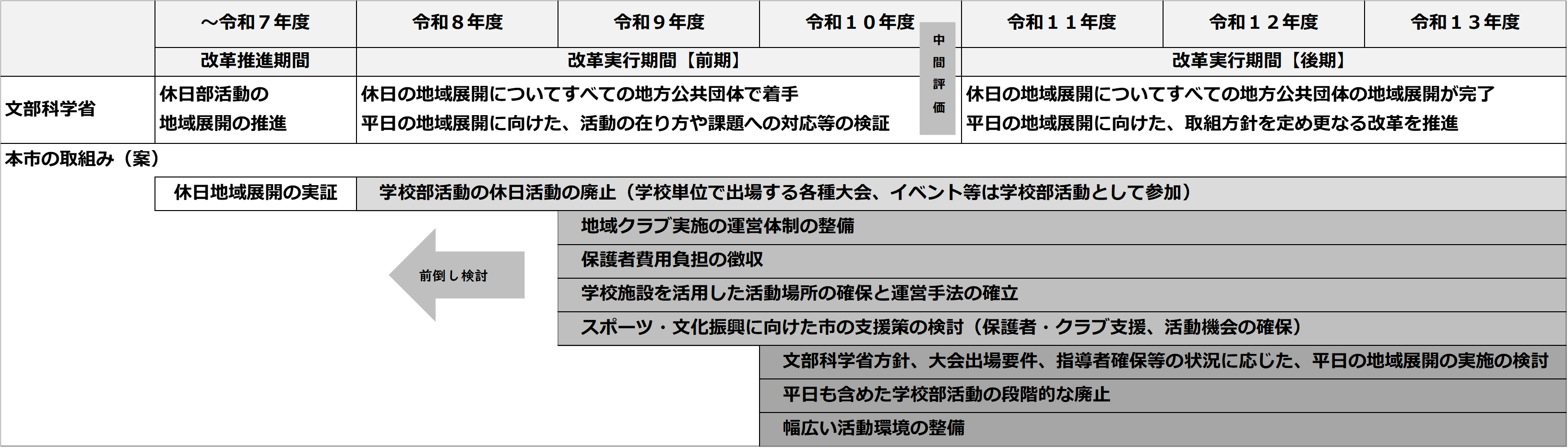 中学校における部活動地域展開について 2025年3月24日更新 部活動改革について 文部科学省は、令和2年9月に「学校の働き方改革を踏まえた部活動改革」にて、休日の学校部活動を段階的に地域へ移行する取り組みを進めると示しました。また、スポーツ庁及び文化庁は、令和4年12月に「学校部活動及び新たな地域クラブ活動の在り方等に関する総合的なガイドライン」にて、令和5年度から令和7年度までの3年間を改革推進期間とし、新たなスポーツ・文化芸術活動の環境整備の進め方を示しました。令和7年5月にはスポーツ庁・文化庁で設置した「地域スポーツ・文化芸術創造と部活動改革に関する実行会議」の最終とりまとめにて、令和8年度から令和13年度までの6年間を改革実行期間とし、令和8年度から令和10年度の前期で平日の地域展開に向けた活動の在り方や課題への対応等の検証を行い、令和11年度から令和13年度の後期で平日の地域展開に向けた取組方針を定めさらなる改革を推進すると示しました。 射水市の取り組み 射水市では、中学校における部活動改革として、令和4年度から市内中学校で休日に活動している学校部活動の地域展開を開始し、令和7年度に休日の地域展開を完了しました。令和8年度から平日の地域展開や地域クラブ活動に関する認定制度、費用負担の在り方等を検討し、生徒のスポーツ・文化芸術活動を学校部活動から地域クラブ活動へと転換していきます。令和13年度には学校部活動の廃止を予定しています。 なぜ部活動改革を進めるの? 少子化により中学校の生徒数が減少しています。生徒数が減少することで、部活動の部員数も減少し、存続が難しくなった部活動が廃部になる可能性が考えられます。中学校内の限られた人的・物的資源の中では、部活動の種目や活動内容が制限され、生徒がやりたい活動ができない状況になってしまいます。 少子化が進む中においても、将来にわたって生徒が継続的にスポーツ・文化芸術活動に親しむ機会を確保・充実していくため、部活動改革を進めていくことが重要です。 部活動の地域展開とは? 生徒のスポーツ・文化芸術活動の場を部活動から地域クラブ活動へ転換していくことを指します。単に中学校内で行われてきた部活動を地域に移すのではなく、学校と地域が連携して、生徒のスポーツ・文化芸術活動の場を地域全体で支えるという発想で取り組んでいます。 地域クラブ活動とは? 地域クラブ活動とは、学校と地域が連携して行う新しい形のクラブ活動で、中学校で行われている部活動とは別に、生徒がスポーツ・文化芸術活動に継続して親しむことができる機会を提供するものです。 令和13年度に向けたロードマップについて 射水市では、スポーツ庁・文化庁で設置した「地域スポーツ・文化芸術創造と部活動改革に関する実行会議」の最終とりまとめに基づき、地域展開実現に向けた事業実施計画として、令和13年度に向けたロードマップを作成しました。地域展開を通じて、豊かで幅広い活動環境を整備し、生涯にわたって全ての世代が地域においてスポーツ・文化芸術活動を楽しむことのできる射水市を目指します。 休日の部活動の地域展開について 令和7年度に市内中学校で休日に活動している学校部活動の地域展開を完了しました。 地域クラブ活動の活動状況(令和7年11月1日現在) (1)スポーツ活動 種目名 主な活動場所 活動開始 バスケットボール ヨシダ大島体育館 令和4年11月~ 剣道(新湊) 新湊アイシン軽金属スポーツセンター 令和4年9月~ 剣道(小杉) 小杉中学校武道場 令和4年9月~ 剣道(小杉南) 小杉南中学校武道場 令和4年9月~ 剣道(大門) 大門中学校武道場 令和4年9月~ 柔道 新湊アイシン軽金属スポーツセンター 令和4年9月~ ハンドボール 大門総合体育館 令和5年9月~ 卓球 ビルト・プレイズ歌の森体育館 令和5年9月~ ソフトテニス 新湊アイシン軽金属スポーツセンター 令和5年9月~ バレーボール(小杉男子) 小杉中学校体育館 令和6年9月~ バレーボール(小杉女子) 小杉中学校体育館 令和6年9月~ バレーボール(小杉南男子) 小杉南中学校体育館 令和6年9月~ バレーボール(小杉南女子) 小杉南中学校体育館 令和6年9月~ バレーボール(大門男子) 大門中学校体育館 令和6年9月~ バレーボール(大門女子) 大門中学校体育館 令和6年9月~ バレーボール(新湊射北女子) 新湊中学校体育館 令和6年9月~ ソフトボール(新湊) 新湊南部中学校グラウンド 令和6年9月~ ソフトボール(大門) 大門中学校グラウンド 令和6年9月~ 軟式野球(新湊大門) 新湊中学校・大門中学校グラウンド 令和7年9月~ 軟式野球(小杉) 小杉中学校グラウンド 令和7年9月~ 軟式野球(小杉南) 小杉南中学校グラウンド 令和7年9月~ サッカー 新湊南部中学校グラウンド 令和7年11月~ 陸上競技(小杉) 小杉中学校グラウンド 令和7年9月~ 陸上競技(大門) 大門中学校グラウンド 令和7年9月~ ヨット 富山県新湊マリーナ 令和7年9月~ バドミントン 射北中学校体育館 令和7年9月~ 体操 大門中学校体育館 令和7年9月~ (2)文化