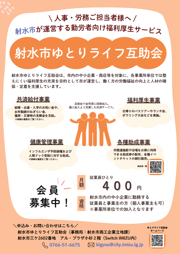 ゆとりライフ互助会 2025年9月24日更新 シェア ポスト イベント情報 ・現在、新着情報はありません。 市内の事業所、商店の皆さん!射水市ゆとりライフ互助会に加入しませんか 射水市ゆとりライフ互助会は、市内の中小企業・商店等で働く皆さんのために、個々の事業所では十分に行えない共済事業や福利厚生事業をお手伝いしています。個人事業所・個人 商店等でも加入できます。 射水市ゆとりライフ互助会の概要 【会費】 月額ひとり400円 【主な事業内容】 ◇共済金給付事業 共済事由一覧(請求できる期間は、事由確定日から3年間となります。) 〇本人死亡・重度障害・傷病休業・住宅災害 ⇒ 本人保障・本人財産保障保険金請求書 本人保障・本人財産保障保険金請求書 〇慶弔見舞金保障 ⇒ 慶弔見舞金保障保険金請求書兼証明書 慶弔見舞金保障保険金請求書兼証明書 ※保険金請求書が、2025年4月より上記の様式に改訂となりました。2028年3月まで現在の様式もご利用できます。 ◇健康管理事業(新) インフルエンザ予防接種助成 人間ドック受診助成 対象者 会員本人のみ 受診助成会員本人のみ、40歳以上 申請期限 令和8年2月末まで 助成額 1,000円/人 3,000円/人 申請書 インフルエンザ予防接種助成申請書 人間ドック受診料助成申請書 提出方法 事業所ごとに必要書類をとりまとめ、互助会事務局へ提出 必要書類 ・インフルエンザ予防接種助成支給申請書・予防接種の領収証の写し(「インフルエンザ予防接種」を受診したことが明記されていること) ・人間ドック受診助成支給申請書・人間ドック受診の領収証の写し(「人間ドック(ドック)」を受診したことが明記されていること) 申請についてよくある質問(FAQ) ◇各種助成事業(いずれも年間会員一人当たり) ①射水市関連施設の利用助成券発行 ○体育関連施設共通利用助成券 200円分 ○文化関連施設共通利用助成券 200円分 ○ホール・会館 催物入場助成券500円分 ○浴場関連施設無料利用助成券 1枚 ○コミュニティバスの割引販売 ②(公財)富山県労働福祉基金の利用助成券あっせん 詳しくはこちら⇒富山県労働福祉基金のホームページ ③各種イベントチケットのあっせん販売 ◇研修事業 日帰りのバス旅行、ボウリング大会などを実施しています。 ※事業内容は年度によって変わることがあります。 最近のイベント一覧 ◇生活・教育資金等の融資あっせんおよび利子補給事業 入会等各種様式 入会申込書 退会申込書 勤続証明書 休業証明書 変更依頼書 互助会規約 射水市ゆとりライフ互助会規約 関連のリンク 全国中小企業勤労者福祉サービスセンター(全福センター) 全国にある各サービスセンターが、サービスセンター事業の発展規模拡大を目指し、スケールメリットを活かした共同事業等を行う組織です。射水市ゆとりライフ互助会は、「全福センター」に加入しており、全福センターの提携施設の割引利用ができます。その他にも、たくさんの協定施設があります。 PDFファイルをご覧になるには、Adobe Readerが必要です。こちらのバナーから無料でインストールできます。 お問い合わせ 産業経済部 商工企業立地課 所在地:〒939-0341 射水市三ケ2602番地 アル・プラザ小杉2階(Switch IMIZU内) 電話:0766-51-6675 FAX:0766-57-1105 Eメールアドレス:kigyou@city.imizu.lg.jp