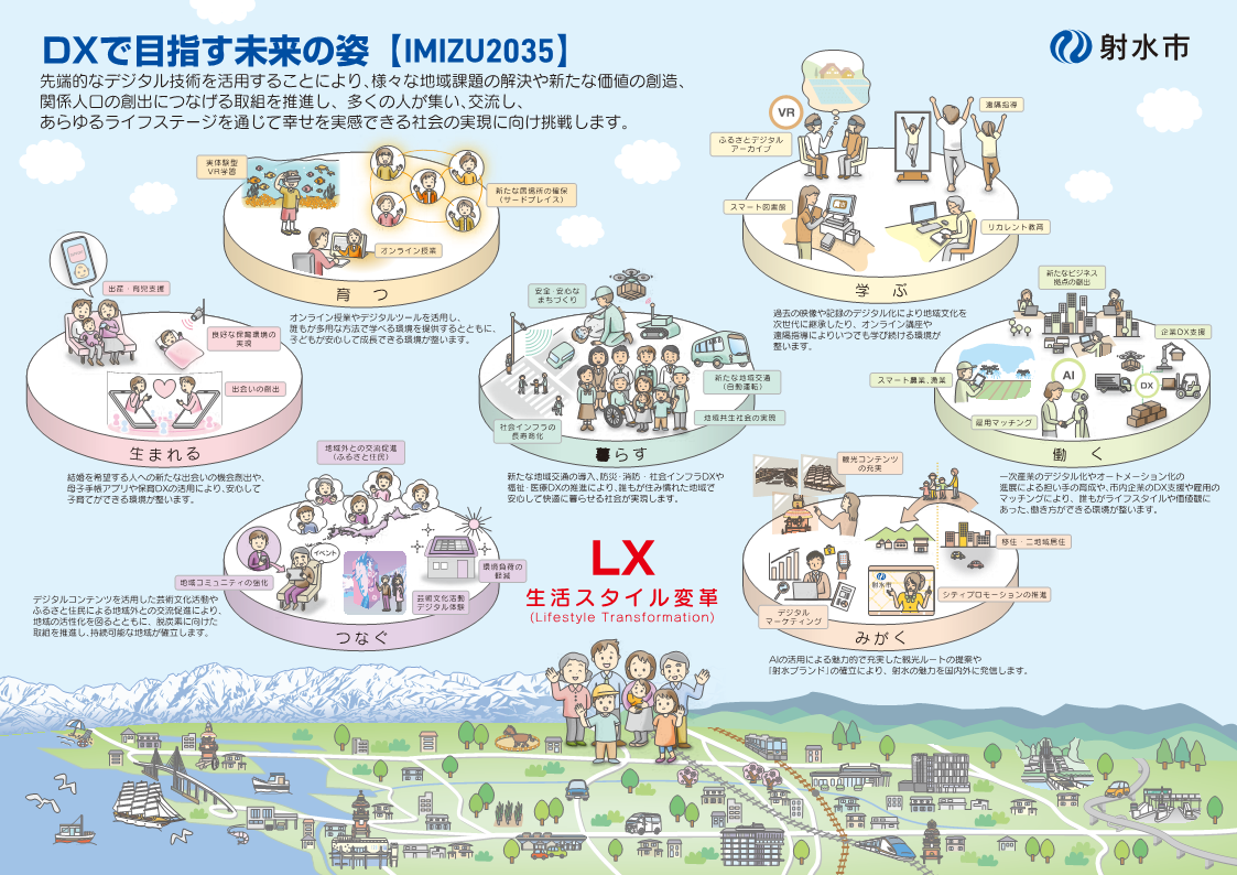 DXの推進 2026年3月10日更新 射水市DXビジョンの改訂について 近年、高齢化や人口減少が深刻化する中、社会を支える担い手不足や、それに伴うサービスの質や産業の競争力、地域社会の機能低下などが懸念されています。 また、デジタル技術の急速な進展に伴い、生活のあらゆる場面でデジタル化が進行しており、個人の価値観やライフスタイルが大きく変化しています。 こうした中、本市では令和3年8月にDXビジョンを策定し、「射水市DXはLX(Lifestyle Transformation:生活スタイル変革)」をキャッチコピーに、地域コミュニティの醸成や移住・定住促進、健康寿命の延伸、便利な地域交通、企業のDX支援、スマート窓口の導入など、様々な分野でDXの推進に取り組んでまいりました。 新たなDXビジョンにおいても、DXを活用した施策に継続して取り組み、多くの人が集い、交流し、あらゆるライフステージで幸せを実感できる社会の実現に向け、市民の皆さんと共にLX(生活スタイル変革)に挑戦します。 ※DX(デジタルトランスフォーメーション):デジタル技術があらゆる領域に浸透することで、人々の生活をより良い方向へ変化させるという概念 射水市DXビジョンVer.2.0 DXで目指す未来の姿 本ビジョンは、第3次射水市総合計画で構成するライフステージに合わせ、DXの推進で目指す10年後(2035年)の未来を想像し、作成しています。 本取組をライフステージに合わせ、あらゆる分野でDXを推し進めるため、市職員が自ら最新のデジタル技術を体験するイベント「IMIZU Future connect day」を開催し、各部局から「DXの推進により、10年後の射水市で実現していると理想的である未来の姿」についての提案募集を行ったほか、富山県立大学の学生と市職員による「未来の姿」を考えるワークショップで出たアイデアも参考にしています。 また、市と関わりのある高等教育機関や民間企業、関係団体の意見も取り入れています。 DXで目指す未来の姿 ※2035年の未来を想像し作成しておりますが、社会経済情勢や国の動向、情報通信技術の進展を踏まえ、適宜見直しを行います。 (1)生まれる 目指す未来の姿 2035年 デジタル技術の活用により、結婚を希望する人に新たな出会いの機会が創出されています。 また、保育の現場ではDXが推進されることで業務の効率化が進み、保育時間の確保や情報の共有により保護者も安心して子育てができる仕組みが整っています。 さらには、地域で子育てを見守り支援する温かな環境が広がり、子育てに関する相談体制が充実することで、誰もが希望を持って家族を築き、安心して生み育てられる社会が形成されています。 想定される事業 2026年~・結婚を希望する人へのデジタル技術を活用した新たな出会いの創出・母子手帳アプリを活用した出産・育児の支援・保育DXを活用した保護者と保育現場の負担軽減・地域での見守りや子育てを応援する環境(オンラインコミュニティ等)の整備 (2)育つ 目指す未来の姿 2035年 子どもたちが学びの場・機会を平等に享受でき、学習意欲や主体性を伸ばせる環境が整っています。オンライン授業やデジタルツールを活用し、不登校や特別な支援を必要とする児童・生徒を含め、誰もが多様な方法で学べる場を提供するほか、実体験型の学習で理解を深めています。 地域の自然や文化に触れる教育が郷土愛と誇りを育み、子どもたちが安心して成長できる社会が構築され、地域と学校が共に未来を築く持続可能な社会が実現しています。 想定される事業 2026年~・データによる学びの支援、多様なツールで学べる環境の実現・授業や行事に参加できない生徒へのオンライン授業の実施・実体験型VR学習による学びの推進・デジタル上での新たな居場所(サードプレイス)の確保・ふるさと射水への愛着を育む教育の充実(オンライン講座 等) (3)学ぶ 目指す未来の姿 2035年 過去の映像や記録のデジタルアーカイブの整備により、郷土への理解と誇りが育ち、地域文化を次世代に継承できる仕組みが確立するとともに、オンライン講座や遠隔指導により子どもから大人まで、いつでも学び続ける環境が整い、市民一人ひとりが、生涯にわたり成長と充実した生活を送る社会が実現しています。 また、新たなデジタル体験が世代間の絆を深め、世代や地域を超えた多様な学びと交流により、活気ある地域社会が創出されています。 想定される事業 2026年~・ふるさとデジタルアーカイブによる郷土学習の充実・スポーツ指導者や経験者からの遠隔指導・eスポーツを通じた世代間交流の促進・リカレント教育(オンライン講座)の実施・スマート図書館の推進 (4)働く 目指す未来の姿 2035年 働きたい魅力的な企業が立地し、若い世代を中心に誰もがライフスタイルや価値観に合った働き方が実現できる社会が構築されています。 一次産業のデジタル化やオートメーション化が進展し、生産性の向上が図られるとともに、担い手の育成も進んでいます。また、地域産品のブランド化が進むことにより、付加価値の向上や