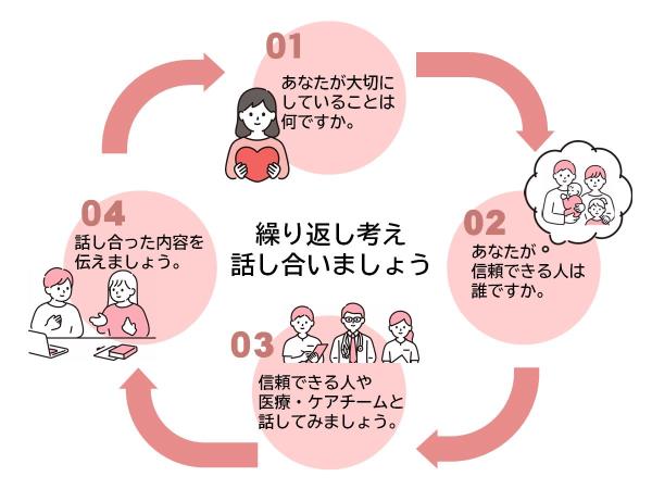 「人生会議」をしてみませんか ~「もしものとき」のために~ 2025年11月21日更新 シェア ポスト 「もしものとき」のことを考えたことはありますか? 「もしものとき」のことを考えてみたことはありますか?「今はまだ元気だから、考えたことはない」という方は多いのではないでしょうか。 命の危険が迫った状態になると、約7割の方が、医療やケアなどについて自分で決めたり望みを人に伝えたりできなくなると言われています。 大きな病気やケガなどで、突然、自分の意思を伝えられなくなる可能性があります。医療やケアに対する希望を、前もって信頼できる人に伝えておくことで、あなた自身が安心できるだけでなく、あなたの代わりに医療の選択をする人の心配や不安を和らげることができます。 これからの人生をより豊かに、自分らしく過ごすために。自分自身で思いを伝えられるときに、あなたの希望や思いを周囲の信頼できる人と共有してみませんか。 「人生会議(ACP)」とは? 人生会議(ACP:アドバンス・ケア・プランニング) ACPは、病気や介護が必要になったときに、「自分はどう生きたいか」「どのような医療やケアを望んでいるか」などをあらかじめ考え、家族や大切な人、医療・介護等の専門職と繰り返し話し合い、自分の思いを共有することです。 愛称として「人生会議」と呼ぶこともあります。 体調や環境の変化により、自分の思いが変わることは自然なことです。 そのため、周囲の信頼する人と繰り返し話し合い、自分の思いを共有することが大切です。 「人生会議」のすすめかた 私たちの気持ちは、体調や環境の変化により、日々変わるものです。気持ちの変化があったときに、その都度話し合い、周囲の信頼できる人たちに共有しましょう。 ■ すすめかた 1 自分は、どんなことを大事にしたいかなどを考えてみましょう。 2 考えたことについて、信頼できる人(家族、友人、医療・ケアチームなど)に話してみましょう。 3 考えたことや話し合ったことを伝えましょう。 4 繰り返し話し合いましょう。 ■ ポイント ・話し合いを重ねていくことで、もし自分が意思表示が難しい状況になっても、周りの人たちが自分の思いや考えに沿った医療や介護を決めることができます。 ・医療や介護のことは、自分のからだの状況などを踏まえて考える必要があり、自分や家族だけで考えることが難しい場合があります。 主治医や看護師、ケアマネジャーなどの専門職から十分な説明を受けながら、一緒に考えてみましょう。 ★参考:「ゼロからはじめる人生会議」 自分の思いや、周囲の人と話し合ったことをウェブ上で書き留めることができます。 書き留めたものを印刷することもできます。 ※ 人生会議は個人の主体的な行いによって進めるものです。「考えたくない」という意思も尊重されます。 「終活」とACPのちがい ■ 「ACP(人生会議)」とは ACPは、「もしものとき」に受ける医療や介護のこと、これからの自分の生き方について、自ら考え、家族や周囲の信頼できる人と繰り返し話し合うことを言います。 ■ 「終活」とは 「終活」は一般的に遺言、相続、お葬式、お墓のことなど、自身の老後や亡くなったときのために備えておくことを指します。 射水市では、このような「終活」に関する希望を書き留めておくためのノートとして「思いを伝えるノート」を作成しています。 ● 射水市終活支援ノート「思いを伝えるノート」について ● 「人生会議」をもっと身近に 人生会議をまんがで分かりやすく解説しています。(出典:厚生労働省) それぞれのストーリーを通して、「人生会議」をより身近に感じていただけると幸いです。 1 「人生会議」のホント 編 2 「人生会議」は口実 編 3 「人生会議」の誤解 編 4 「人生会議」は誰とでも 編 5 「人生会議」のきっかけ 編 6 「人生会議」って何? 編 (参考) ・「人生会議」してみませんか (厚生労働省ホームページ) PDFファイルをご覧になるには、Adobe Readerが必要です。こちらのバナーから無料でインストールできます。 お問い合わせ 福祉保健部 地域福祉課 所在地:〒939-0294 射水市新開発410番地1 電話:0766-51-6625 FAX:0766-51-6657 Eメールアドレス:chiiki@city.imizu.lg.jp